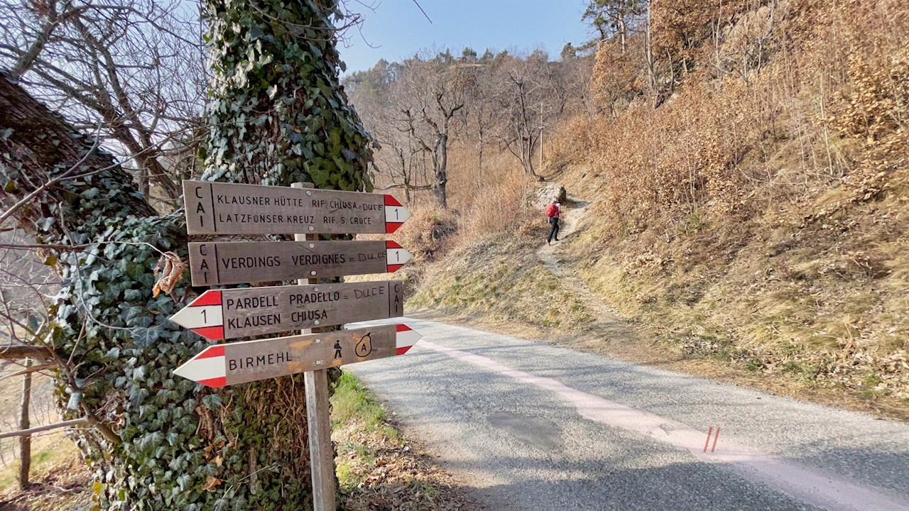 Vom Gasthaus Huber führt die Wanderung zur letzten Weggabelung zurück, von welcher der Birmehlweg durch aussichtsreiche Wiesen und lichte Haine zum geschichtsträchtigen, insbesondere in der Törggelezeit beliebten Buschenschank Moar zu Viersch ansteigt. Während des Anstiegs entfalten sich malerische Ausblicke auf Kloster Säben, Klausen und die umliegenden Anhöhen und Berge.