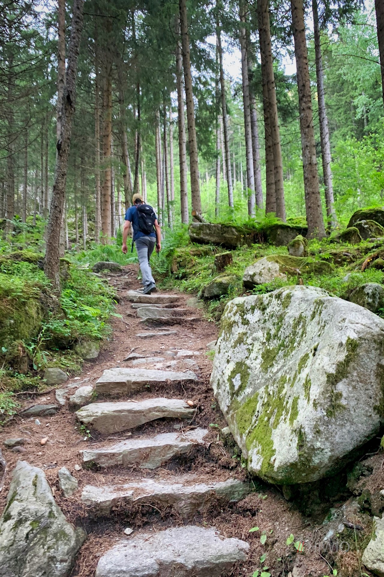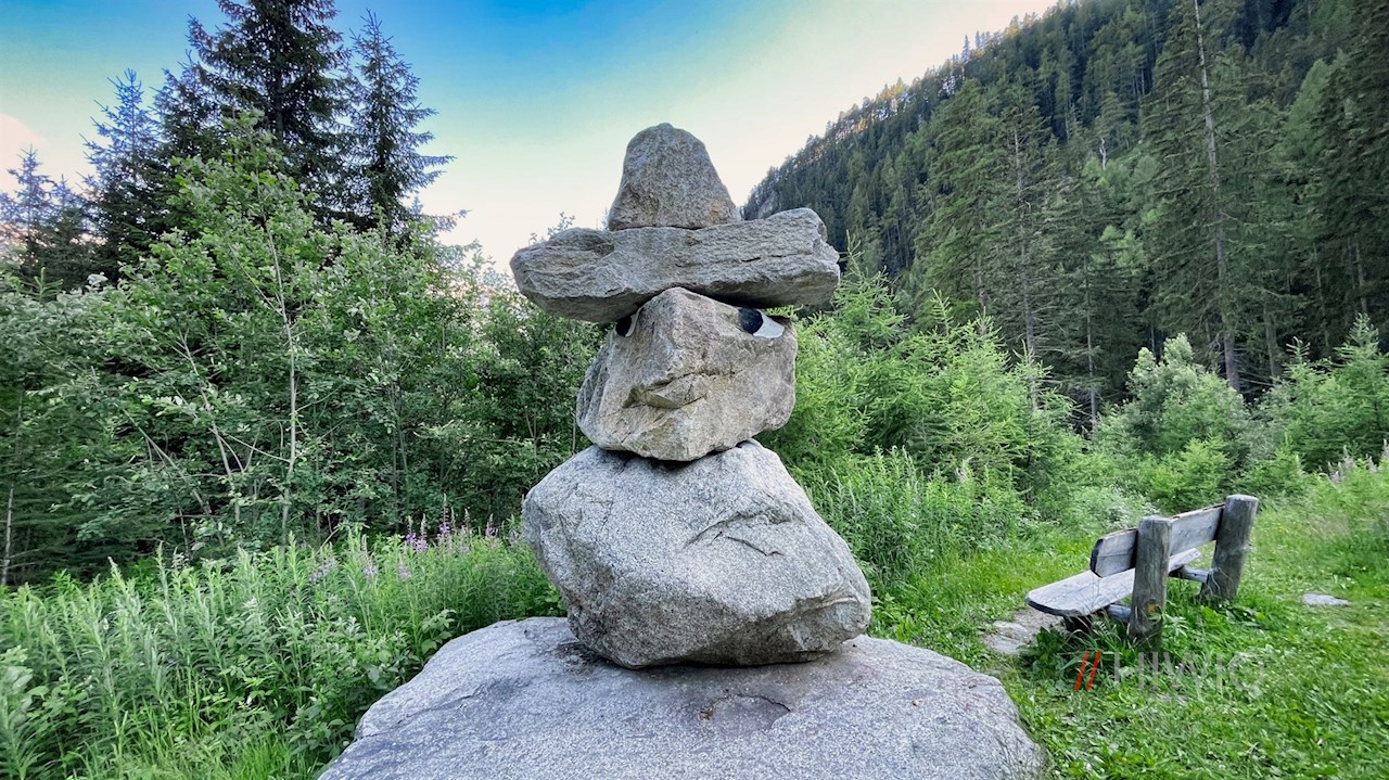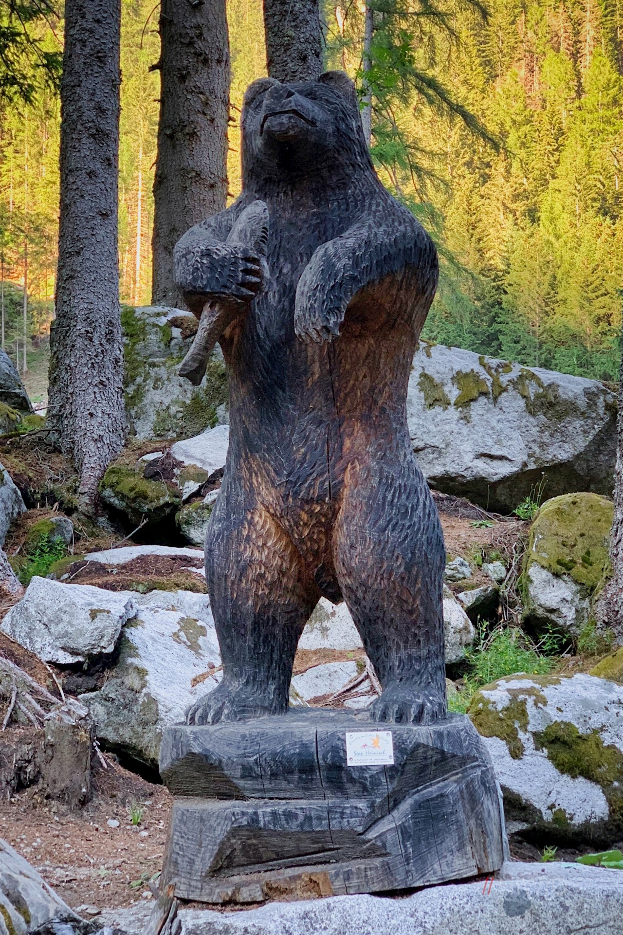 Er führt an einem Hotelkomplex vorbei und geht dahinter in einen schönen, von suggestiven Holzskulpturen gesäumten Wiesenweg über. Dieser quert im sanften Anstieg die aussichtsreichen Hänge und mündet schließlich in ein asphaltiertes Sträßchen, das zu einem Hof und dem dahinter liegenden Frankbach Wasserfall hinabführt.