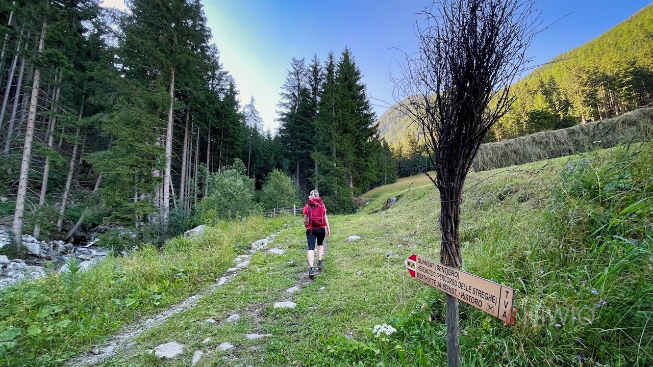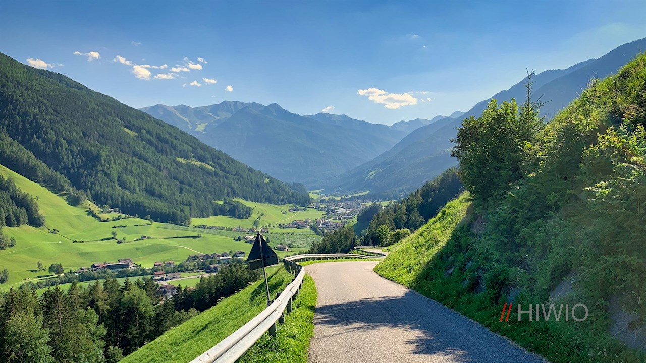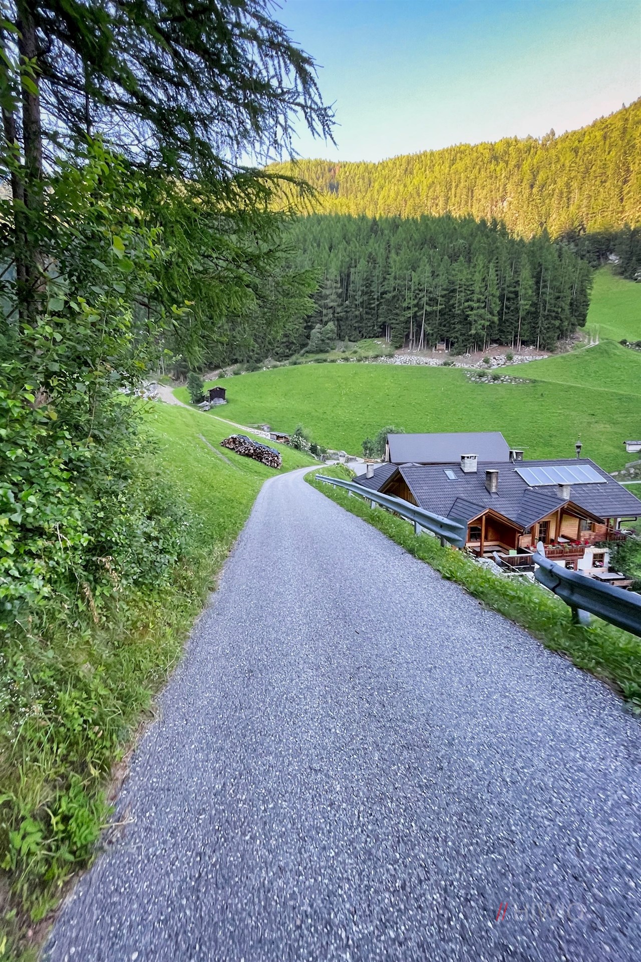 Hinter der Bizathütte setzt sich die Wanderung auf dem Ahrntaler Sonnenweg Nr. 6A fort. Er zieht sich durch Wald und Wiesen zu einem Hof, bei dem er in ein asphaltiertes Sträßchen übergeht.