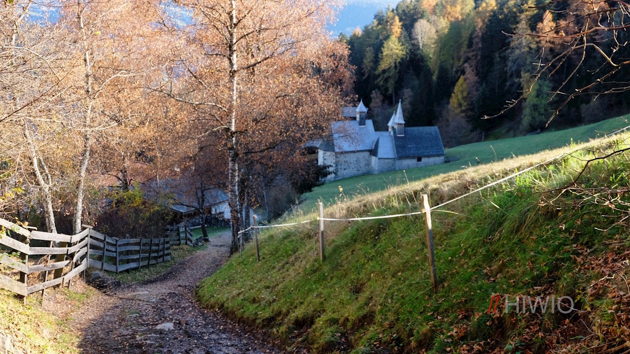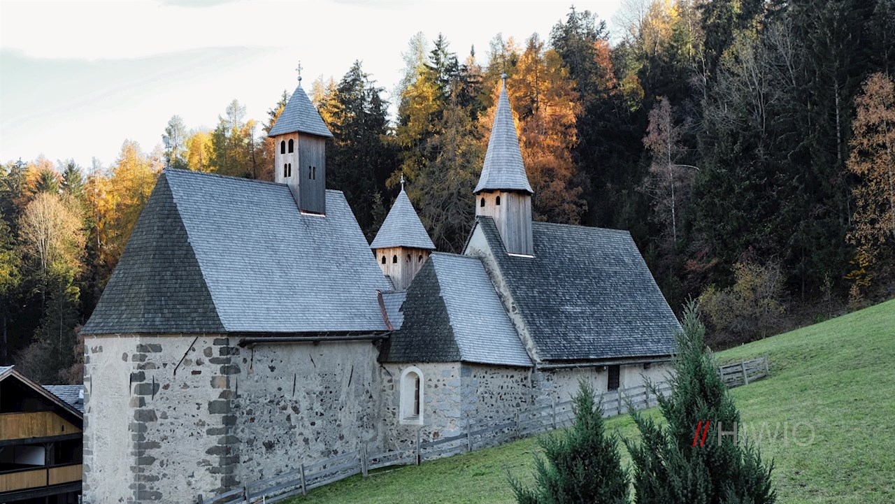 Von Briol steigt der Wanderweg Nr. 27 sanft zu jenem Kirchenensemble ab, dem der Ort Dreikirchen seinen Namen verdankt. Wenngleich die drei Kirchen wie ein einziges Bauwerk anmuten, wurden sie zu unterschiedlichen Zeiten zwischen dem 13. und 15. Jahrhundert errichtet. Die genaue Entstehung dieser drei Gotteshäuser, die in ihrem Inneren farbenfrohe Fresken aus der spätmittelalterlichen Brixner Schule und gotische Flügelaltäre bergen, liegen allerdings im Dunkeln.