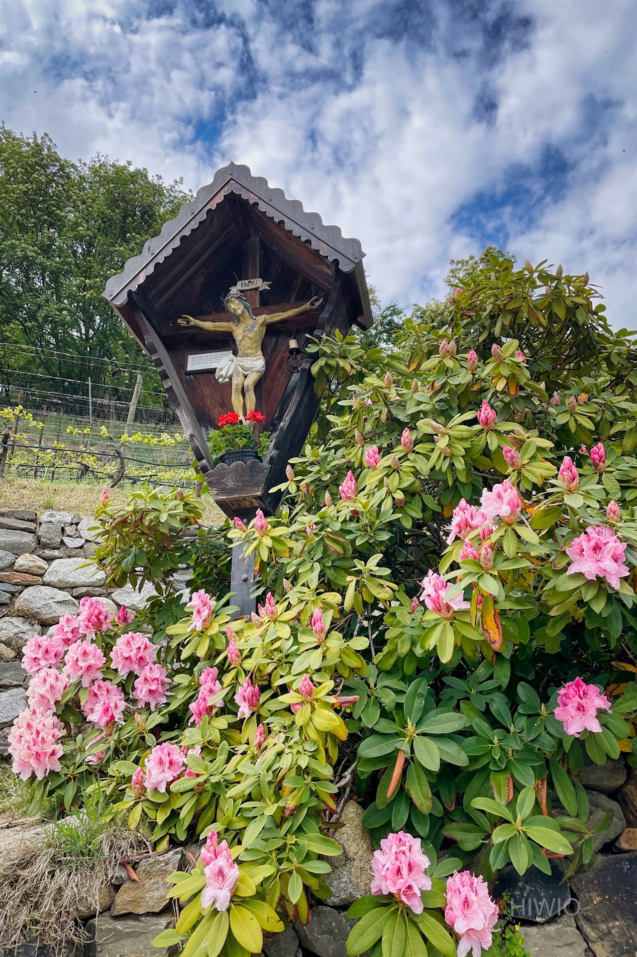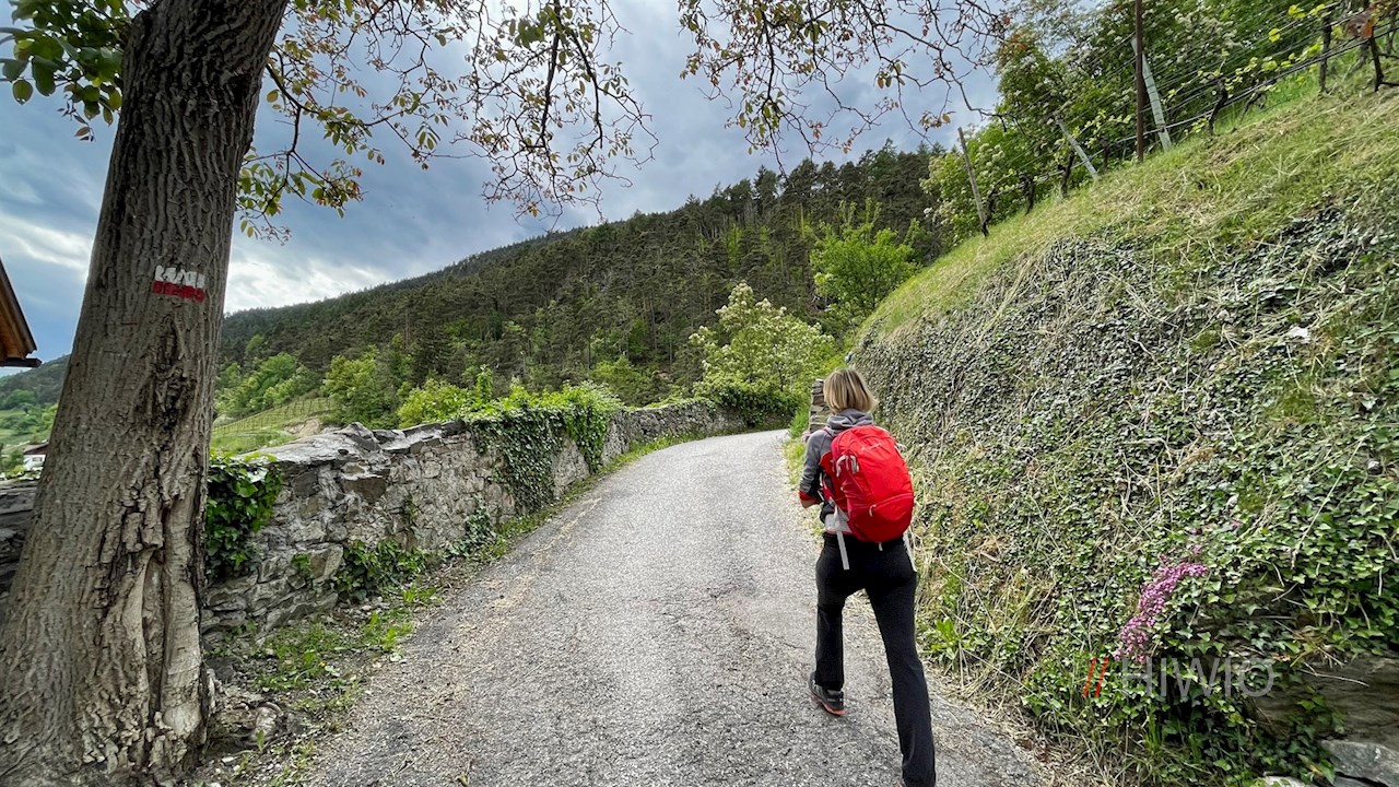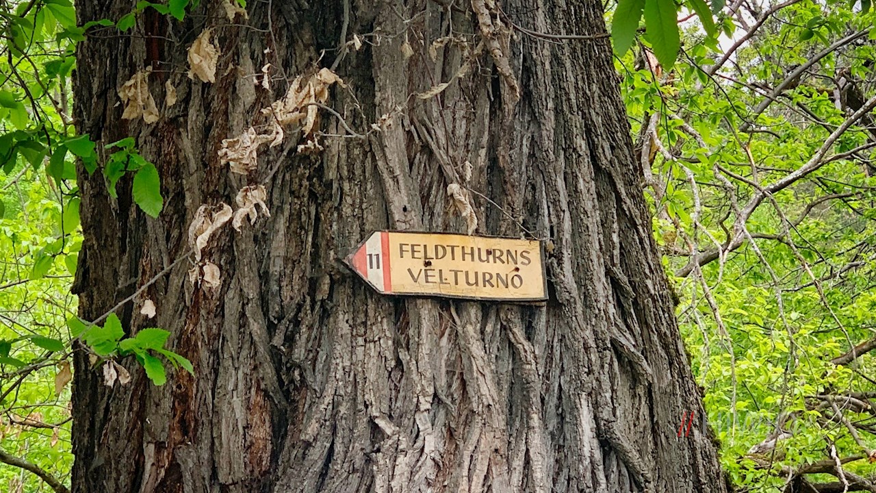 Hier weist das Wanderschild Nr. 10 den Anstieg nach Tschötsch. Er folgt einem asphaltierten Sträßchen, das sich sanft, aber stetig in die Höhe windet.