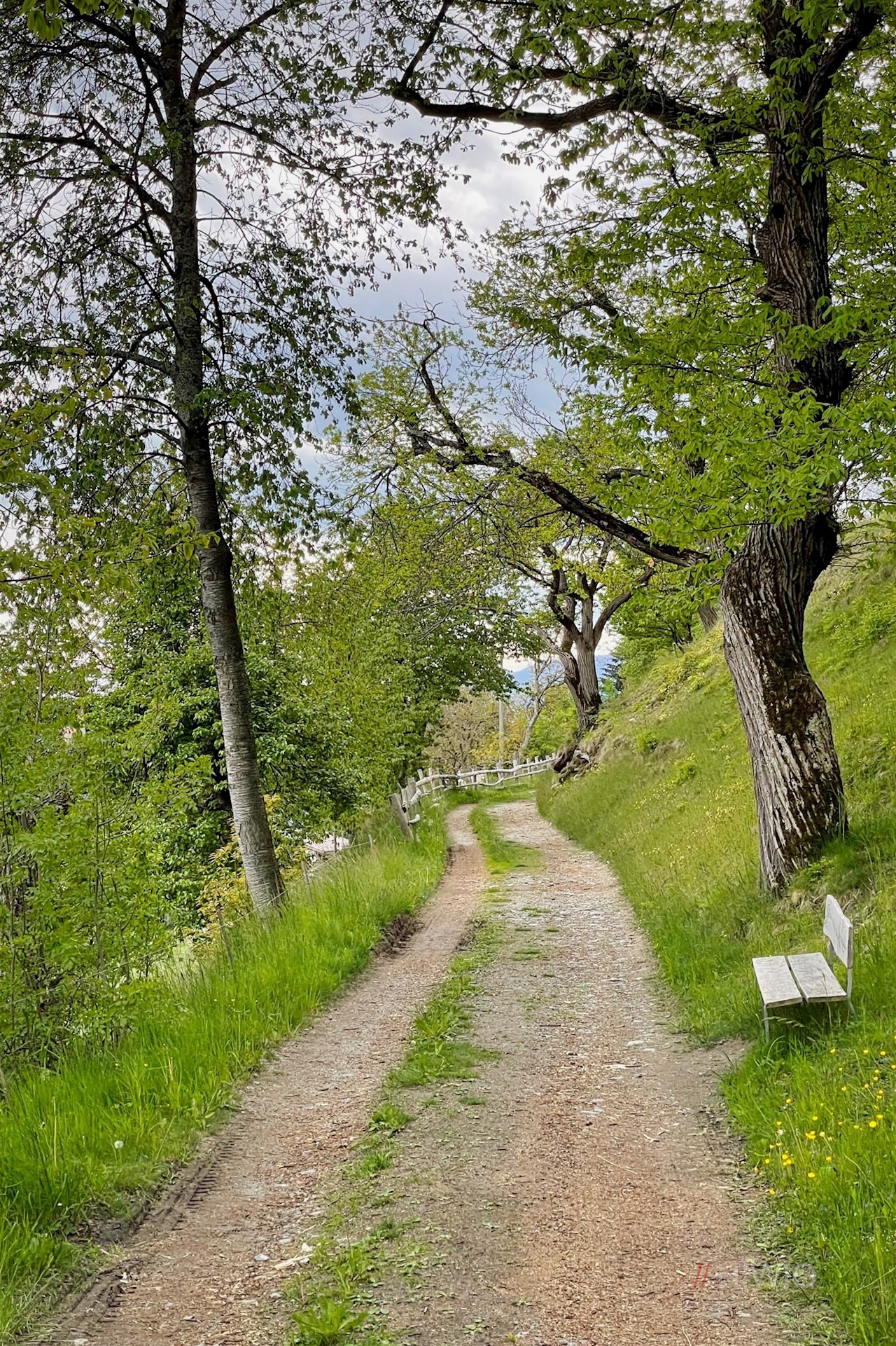 Hinter dem Wöhrmaurer geht die Wanderung in einen breiten, anfangs von anmutigen Kastanienbäumen gesäumten Feld- und Wiesenweg über.