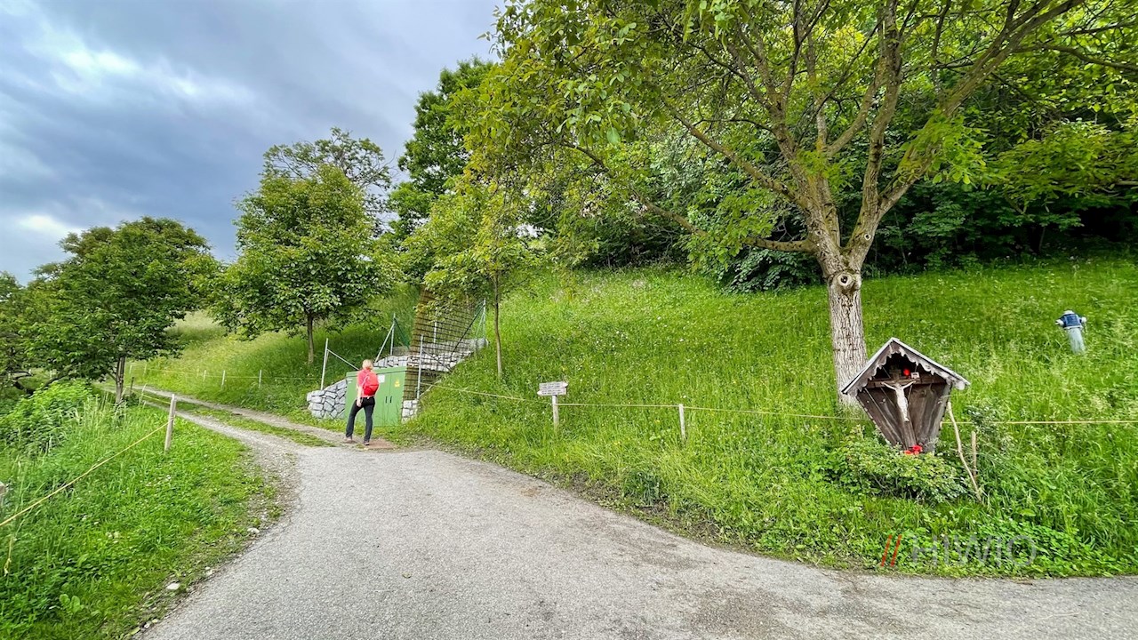 Er überquert zunächst den kleinen Trametschbach und steigt dann durch Wald und aussichtsreiche Wiesen zu einer idyllisch gelegenen Häusergruppe an.