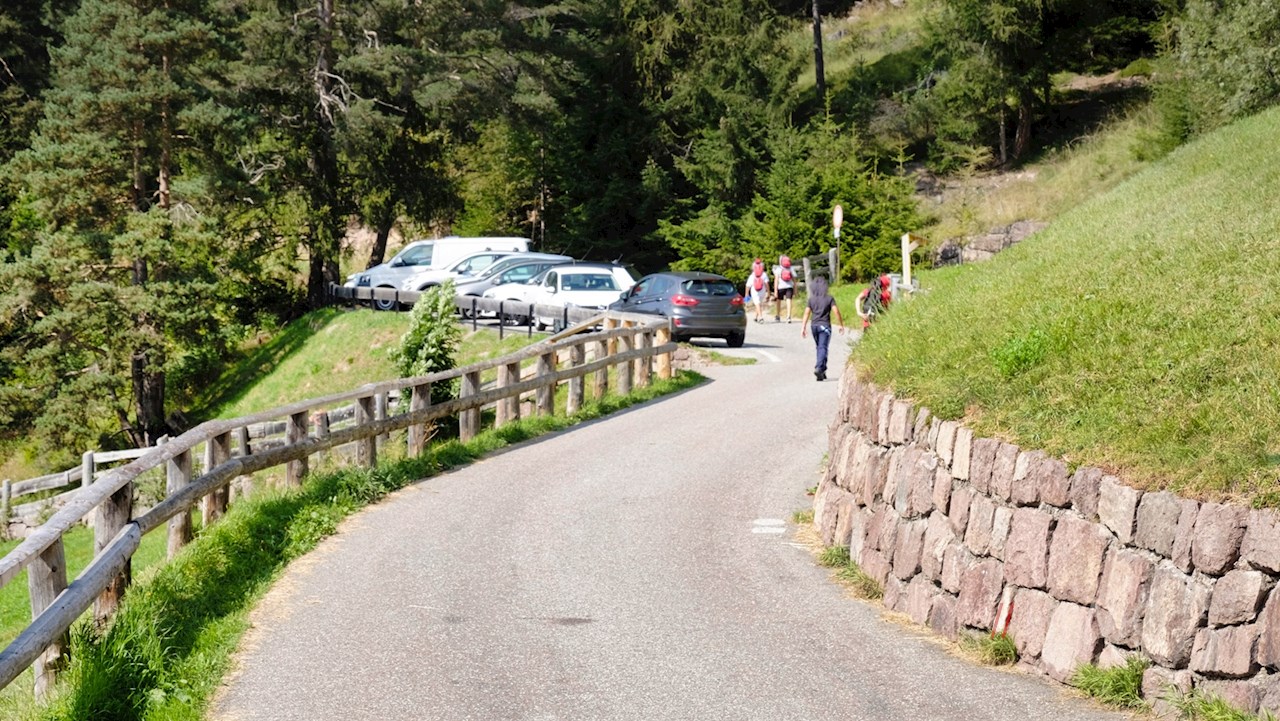 Die Wanderung zur Brogleshütte beginnt auf dem kleinen Wanderparkplatz Runcata oberhalb von St. Ulrich in Gröden (Anfahrt über die Streda Cuca).