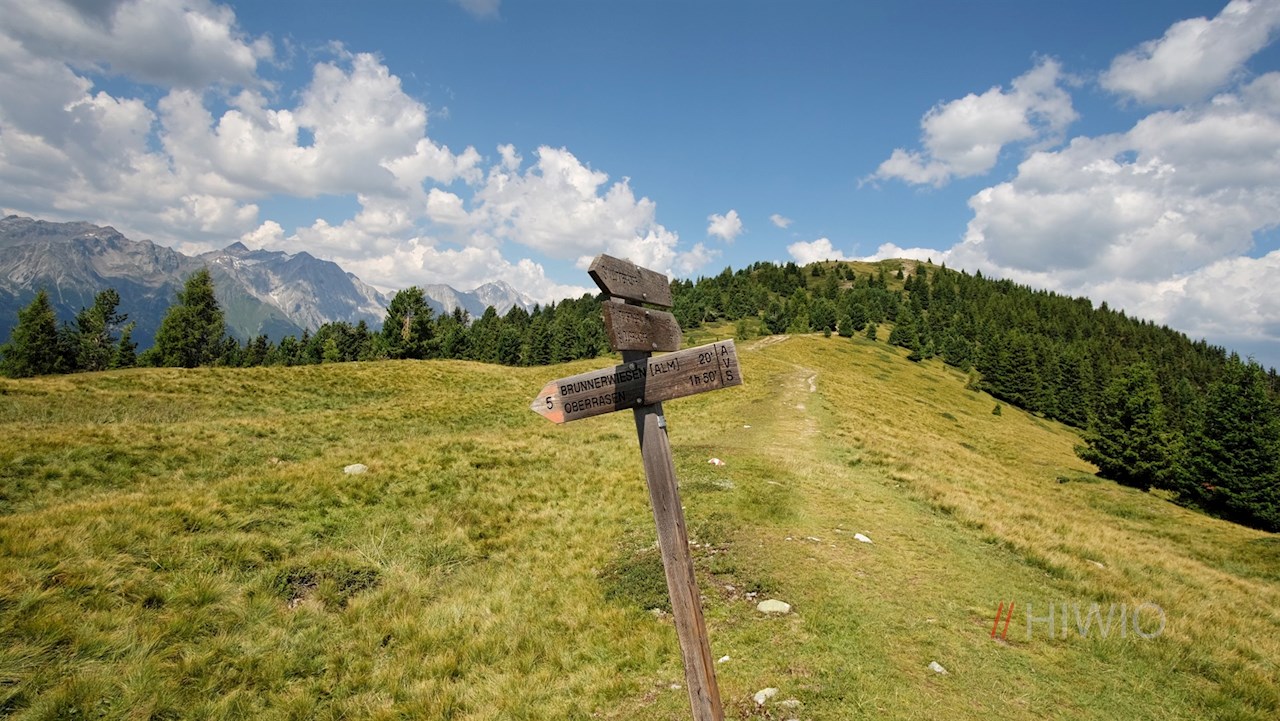 Am Parkplatz schlägt man den links abzweigenden Waldweg Nr. 31 zur Brunnerwiesen Alm ein. Längs des breiten, sanft ansteigenden Weges öffnen sich ab und an schöne Ausblicke auf das tiefer liegende Tal und die ringsum aufragenden Gipfel.