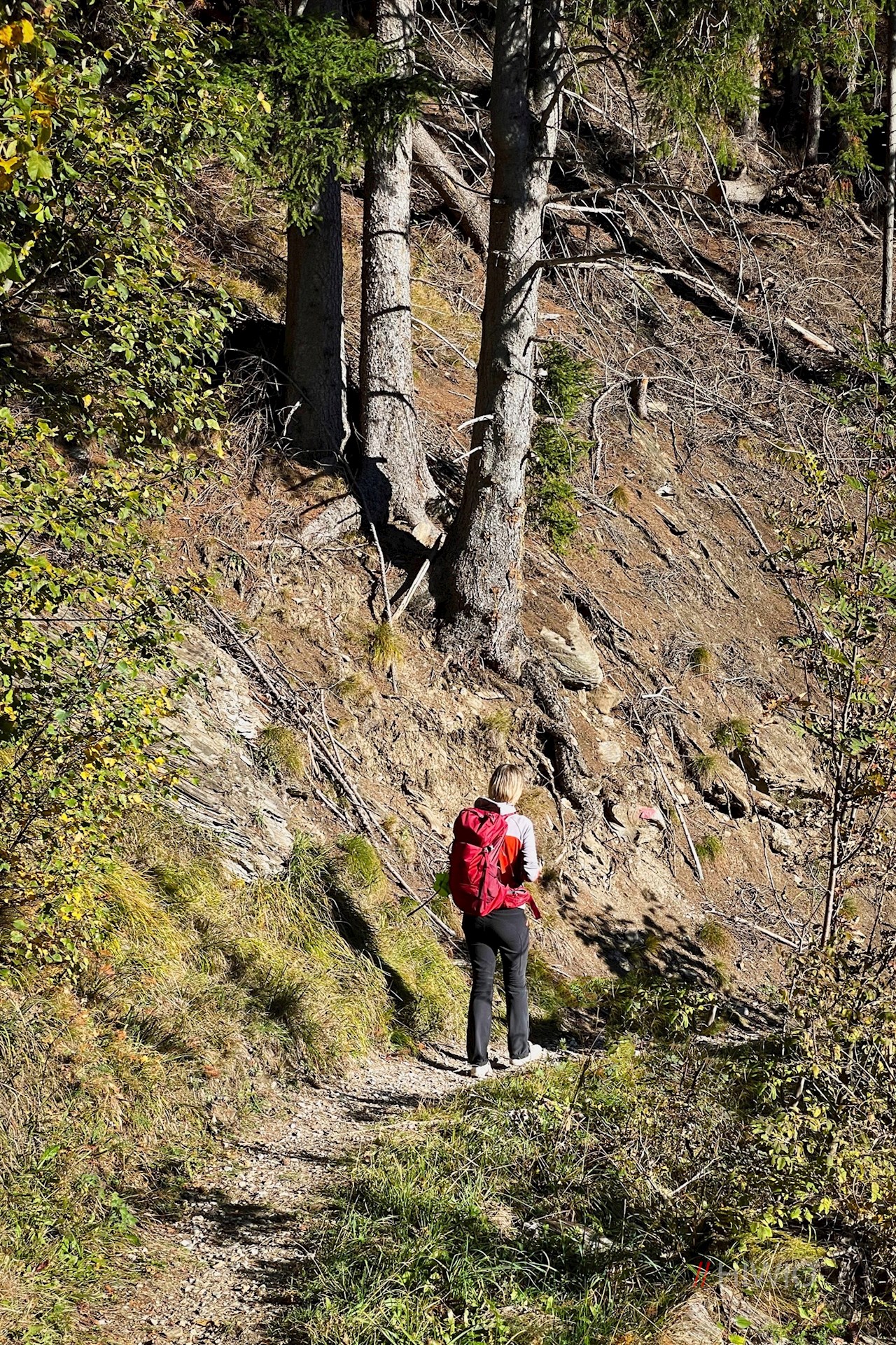 Er führt im angenehmen Anstieg an den letzten Häusern vorbei, nähert sich zusehends dem imposanten Autobahnviadukt und taucht schließlich in einen lichten Wald ein, durch den er sich nahezu eben seinen Weg bahnt.