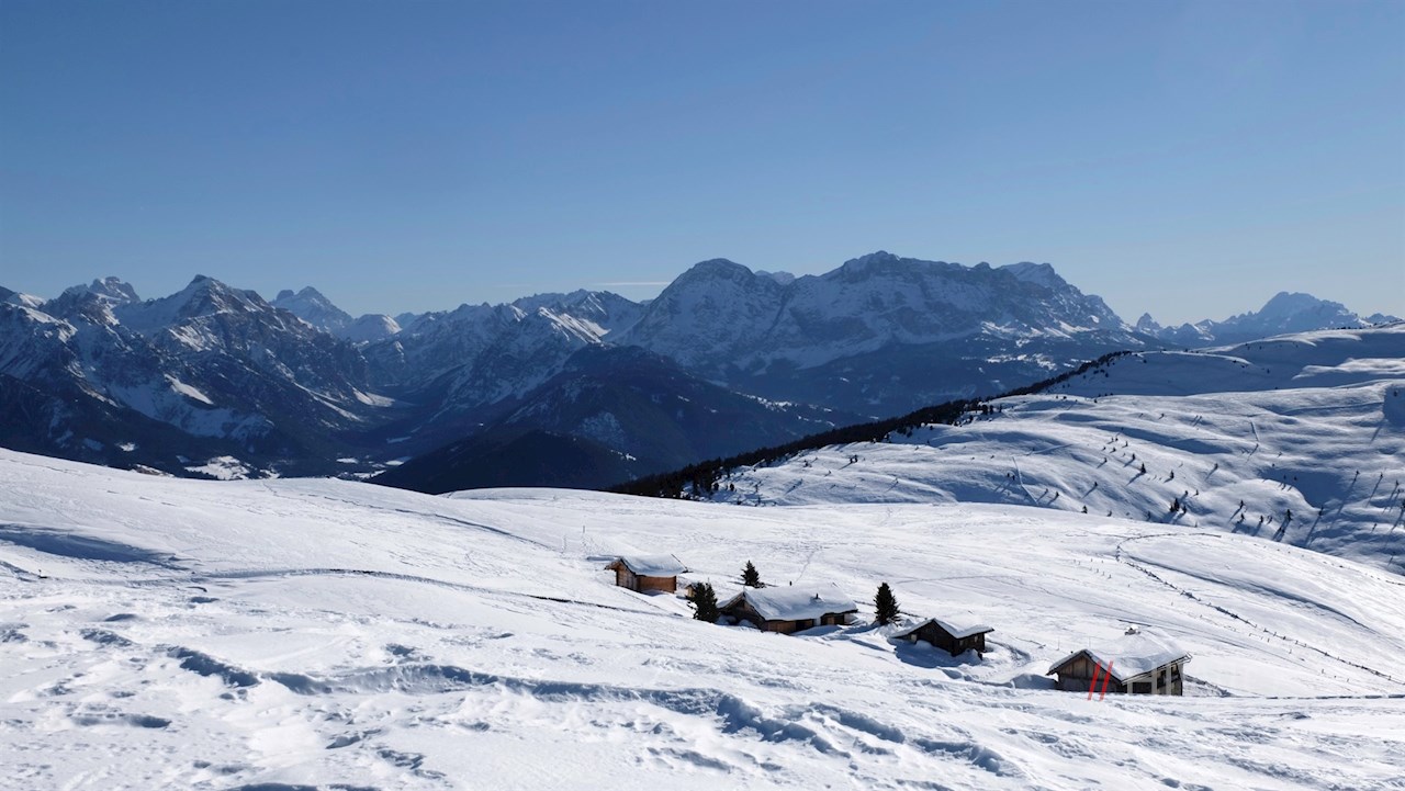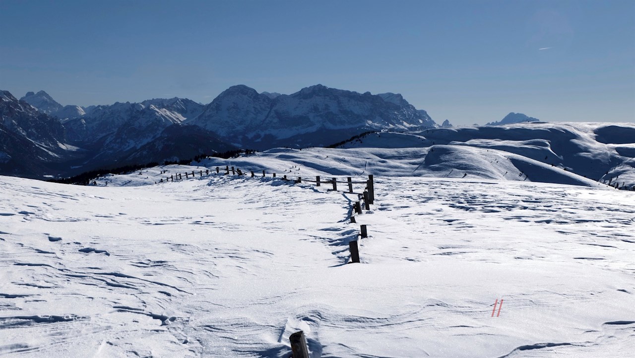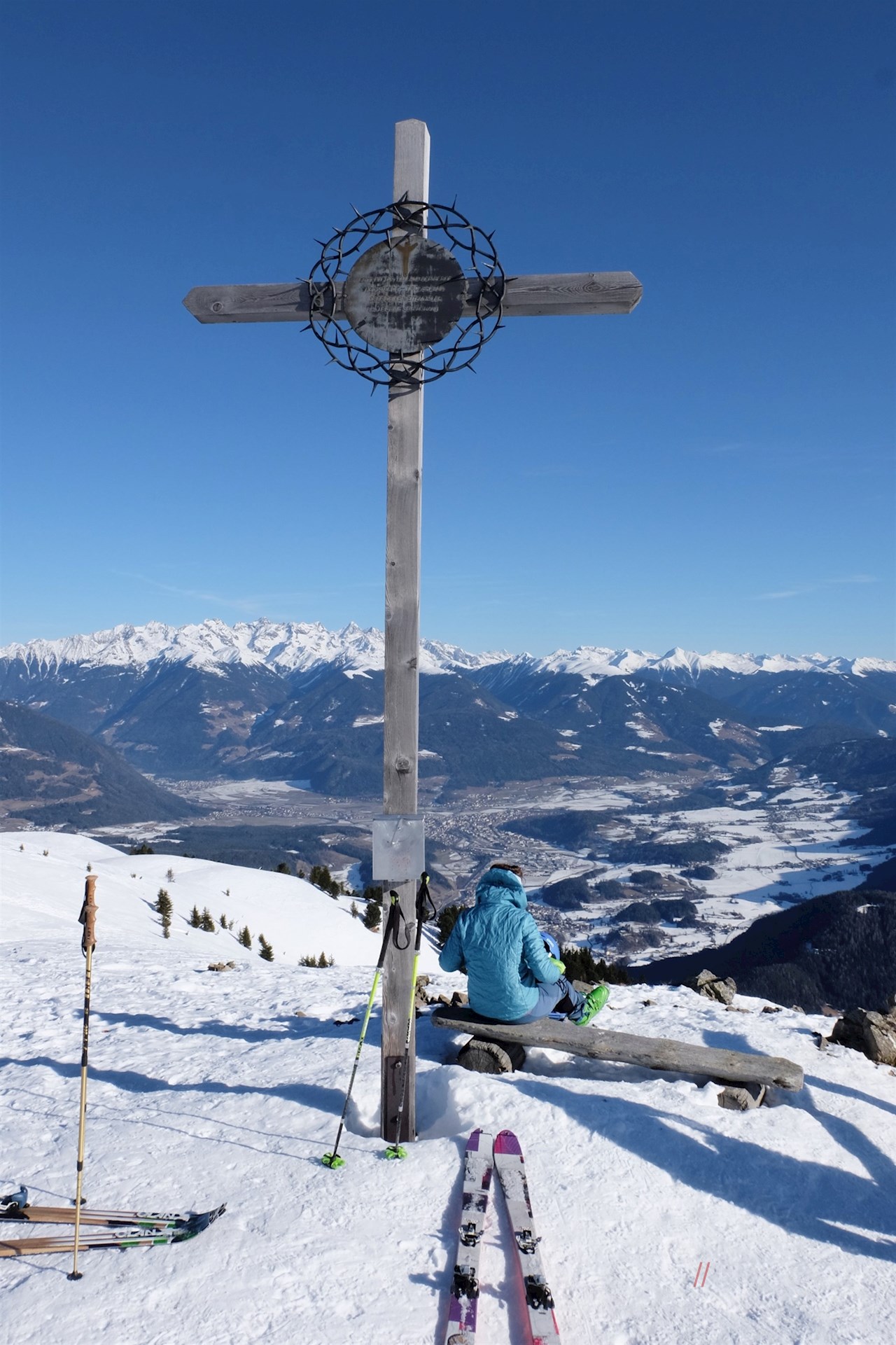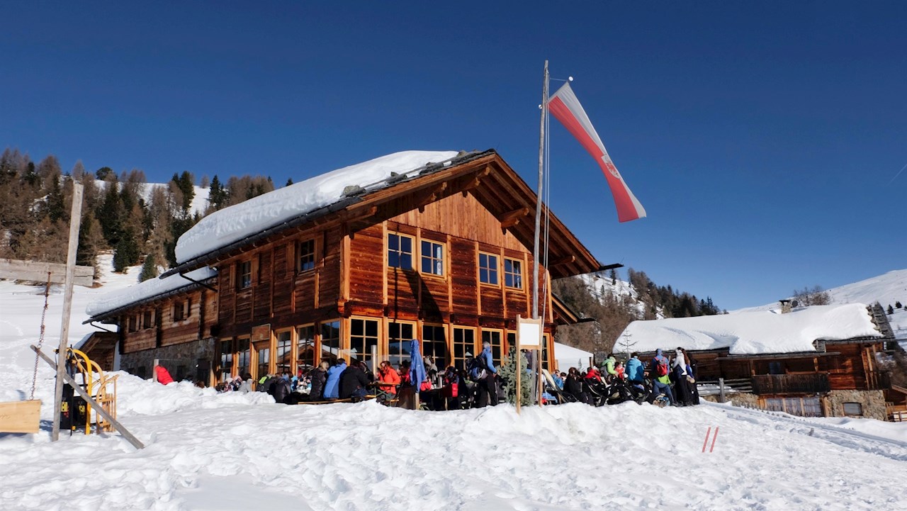 Der Campill (Hörschwanger Kreuz) auf der Lüsner Alm ist auch im Winter ein lohnender Aussichtsgipfel. Zu seinen Füßen lädt die beliebte Kreuzwiesenalm zur genüsslichen Einkehr.