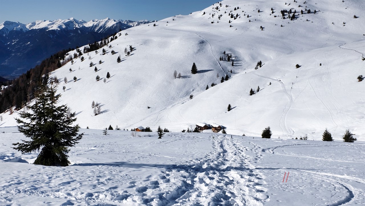 Die Winterwanderung auf den Campill nimmt auf dem Wanderparkplatz oberhalb des Lüsner Weilers Flitt ihren Ausgang.