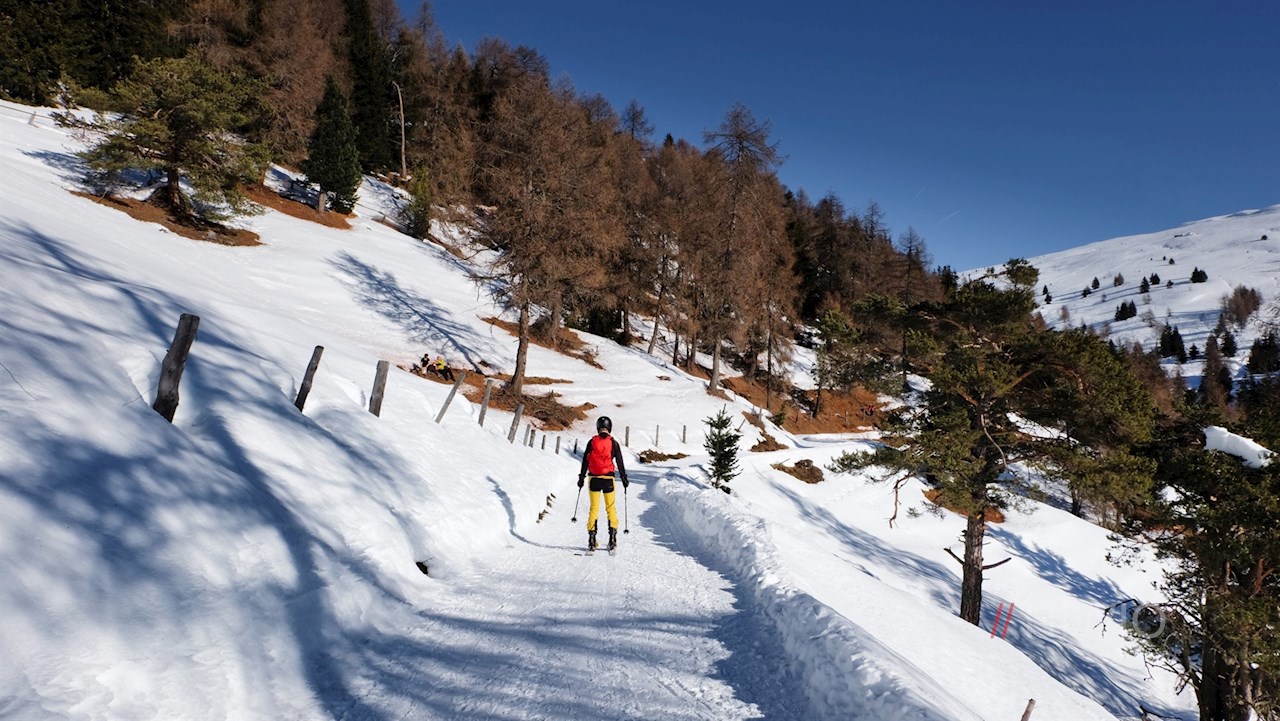 Direkt am Parkplatz zweigt der Weg Nr. 2 in Richtung Campill ab, der wenig später in den breiten, sanft ansteigenden Rodelweg mündet. Wer einen schnelleren, etwas steileren Anstieg bevorzugt, kann bei guter Schneelage auch den rechts abzweigenden Waldpfaden folgen. Alternativ dazu kann man den breiten Weg beibehalten.