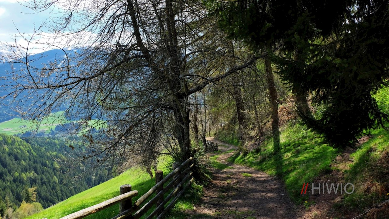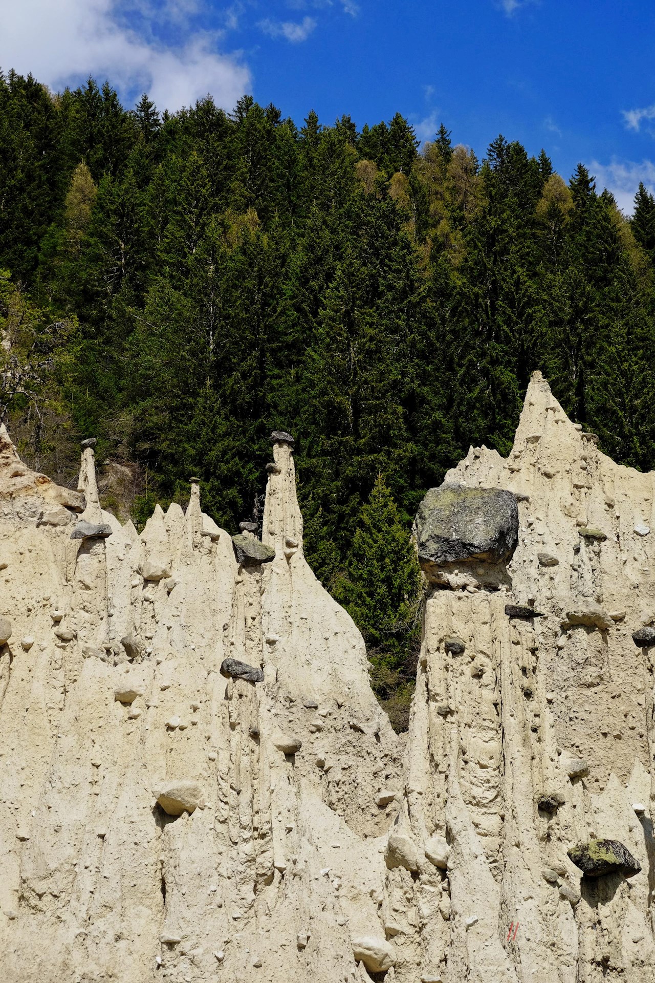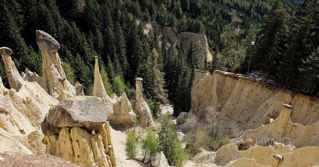 Am Rande der anmutigen Erdpyramiden schlängelt er sich zum Weg Nr. 1A hinab und eröffnet dabei spektakuläre Nahblicke auf die lehmhaltigen Erdpfeiler.