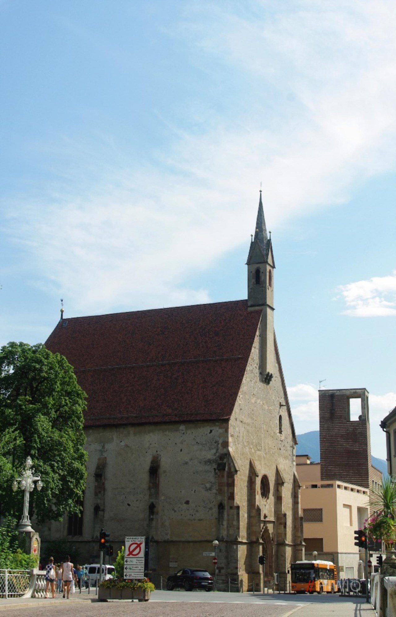 Nachdem beide im Jahre 1419 den wütenden Fluten der über die Ufer getretenen Passer anheimgefallen waren, wurden sie im Laufe des 15. Jahrhunderts im Stil der Spätgotik wiederaufgebaut. Während das Spital zu Beginn des 20. Jahrhunderts vom (alten) Meraner Krankenhaus in der Goethestraße abgelöst und später abgerissen wurde, werden im geschichtsträchtigen Gotteshaus bis heute Messen gefeiert. Sein Inneres birgt übrigens wertvolle Holzstatuen und Fresken aus dem 14. und 15. Jahrhundert.