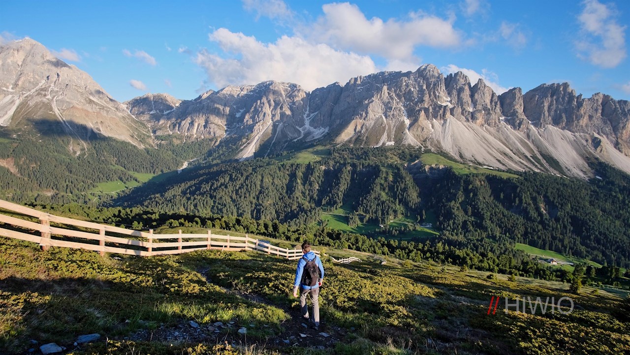 Der Dolomiten Panoramaweg auf der Plose eröffnet atemberaubende Ausblicke auf die nahen Felswände des Peitlerkofel und der Aferer Geisler. Die hier vorgeschlagene Variante führt an der beliebten Schatzerhütte vorbei.