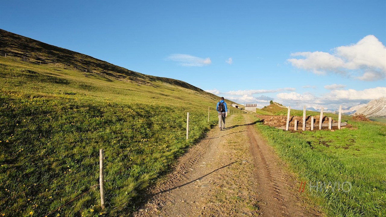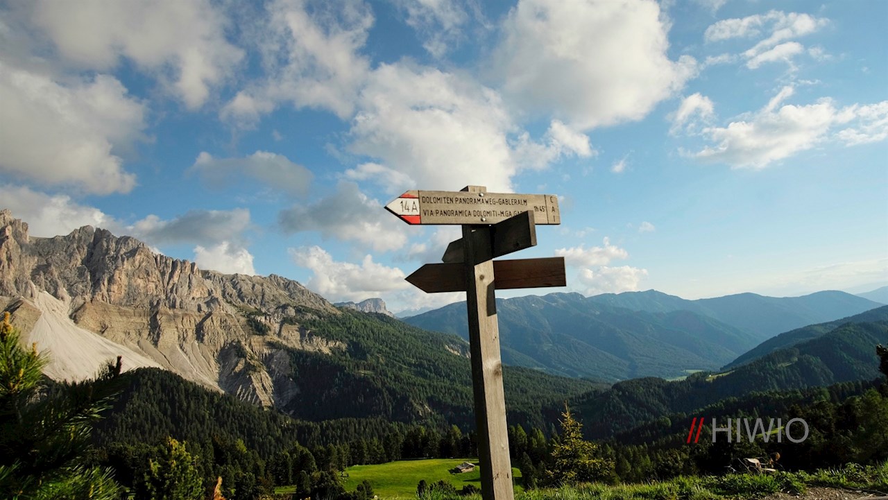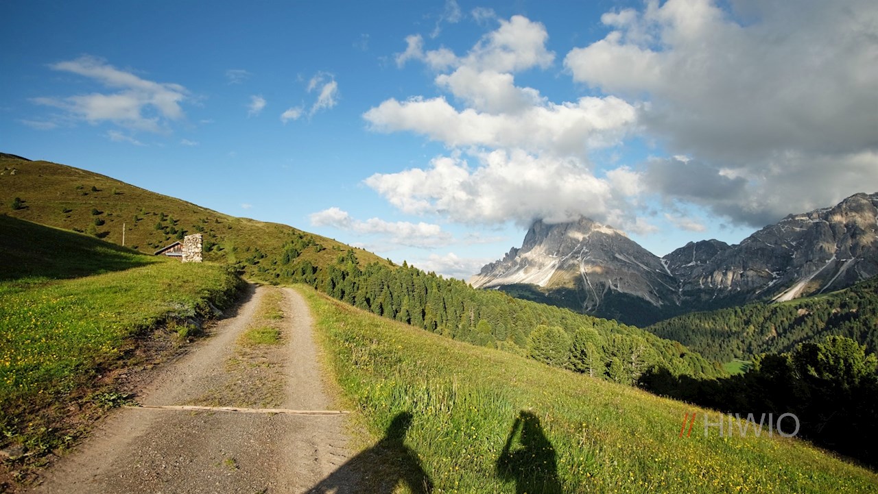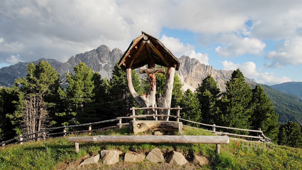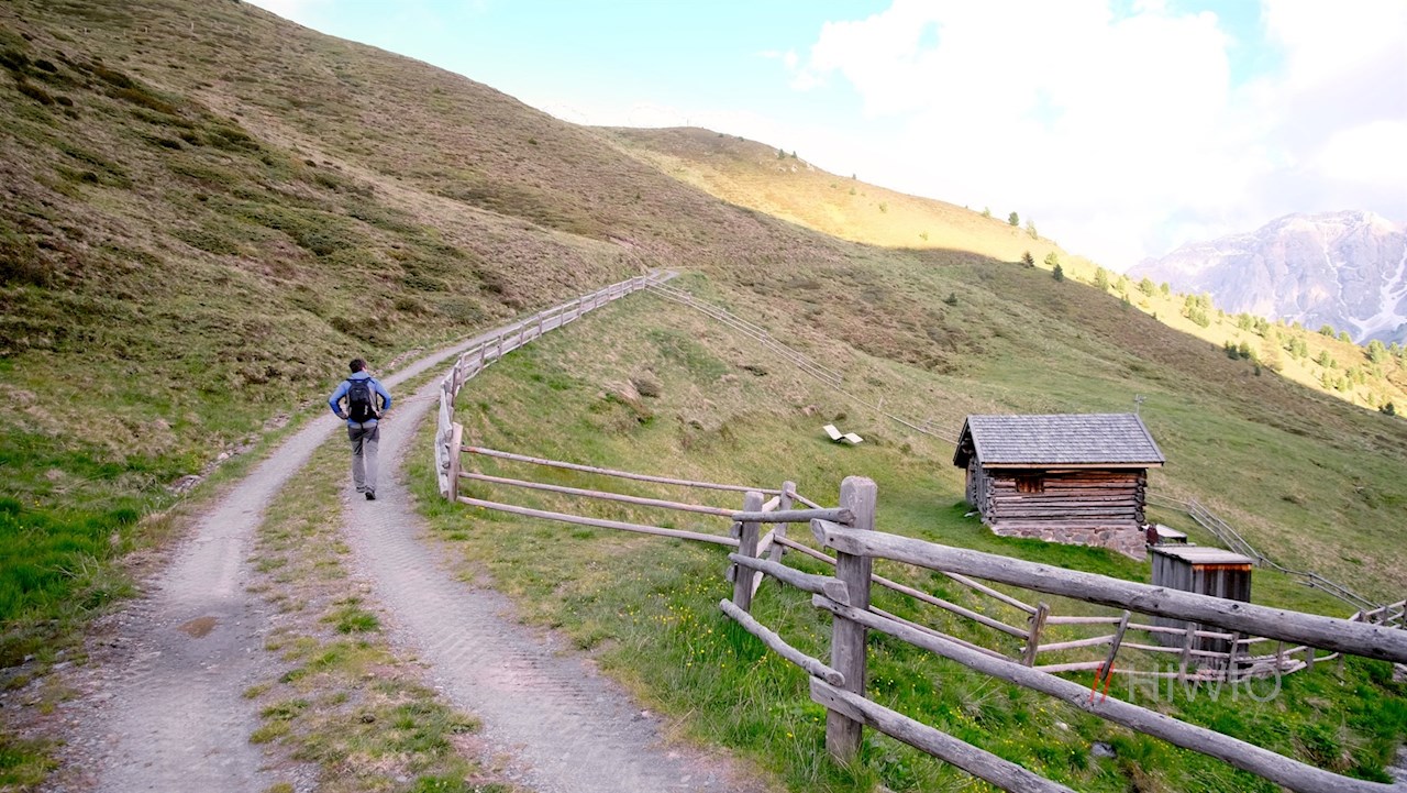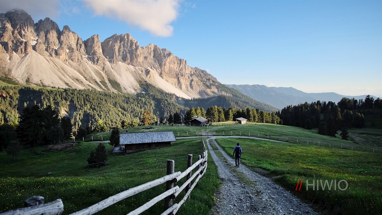 Hinter der Schatzerhütte zweigt alsbald der Dolomiten Panoramaweg Nr. 14A links ab. Er schlängelt sich im sanften Anstieg durch die idyllische Almlandschaft und eröffnet dabei immer neue Perspektiven auf den wuchtigen Peitlerkofel und die anmutigen Aferer Geisler, die im bezaubernden Kontrast zu den blumenreichen Wiesen stehen.