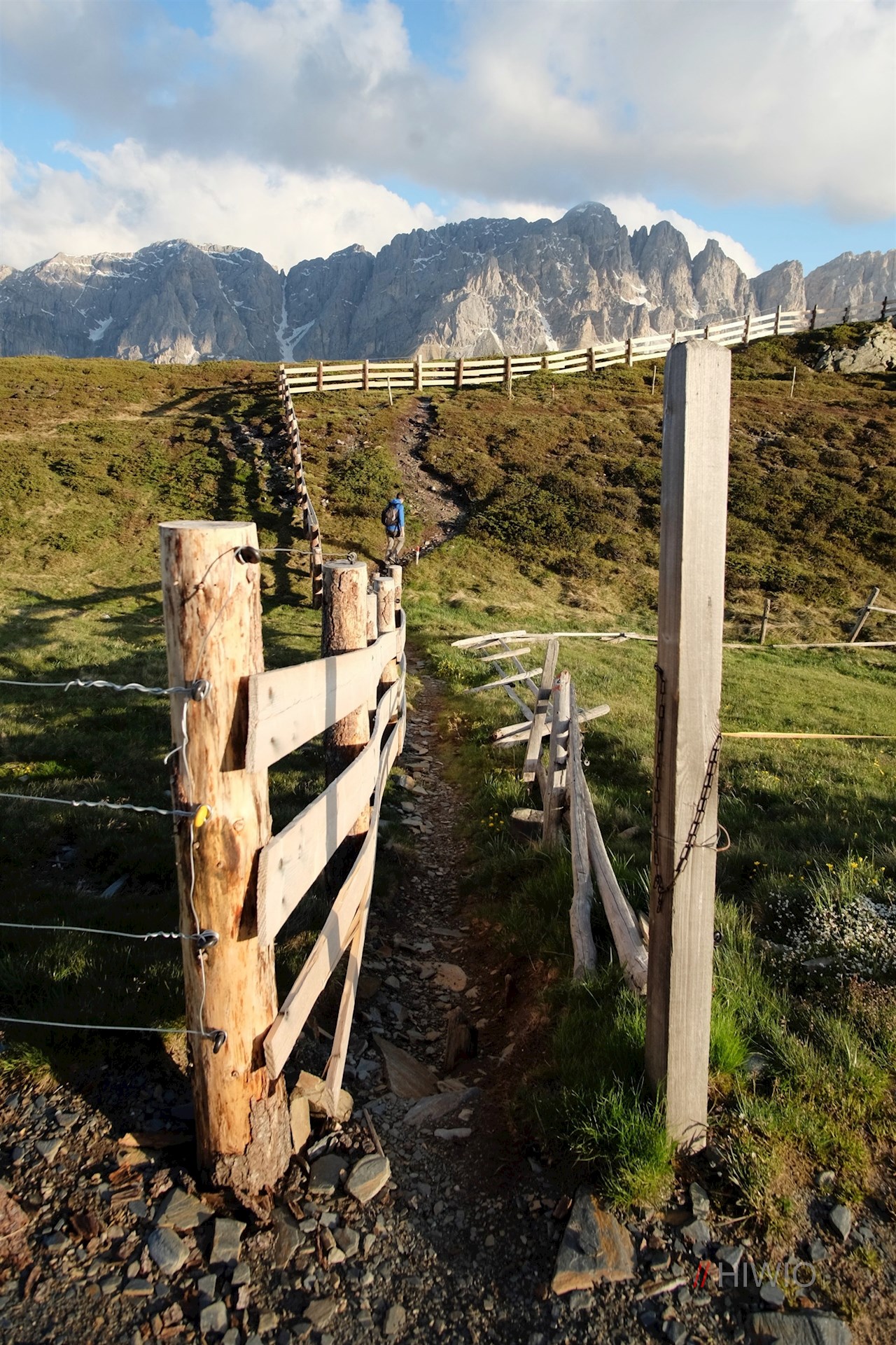 Am höchsten Punkt der Wanderung führt der Panoramaweg einen hohen Weidezaun entlang und fällt wenig später über einen mit Zwergsträuchern bewachsenen Hang ab. Unten mündet er erneut in einen breiten Wanderweg, der an verstreuten Almhütten vorbei zur einladenden Schatzerhütte zurückführt.