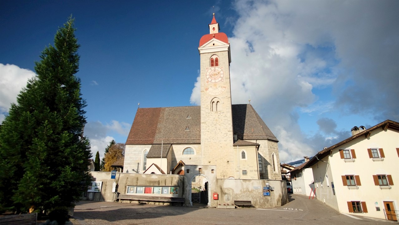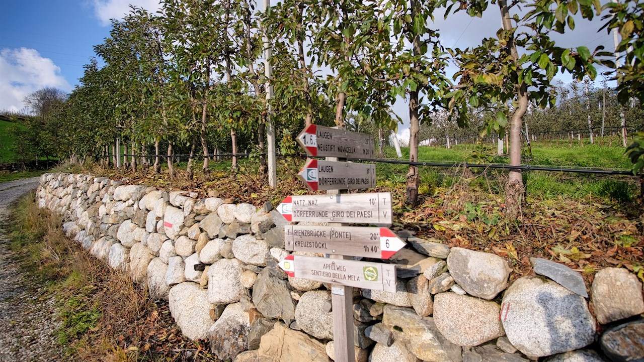 Unsere leichte Wanderung nimmt bei der Dorfkirche des Apfeldorfes Natz seinen Ausgang. Stets der Beschilderung Dörferrunde Laugen folgend, wandert man zunächst zwischen Höfen und Häusern die asphaltierte Straße hinab.