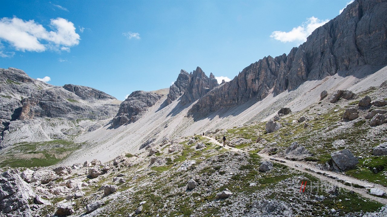 Weiterhin der Wegnummer 101 in Richtung Drei Zinnen Hütte folgend, schlängelt sich der recht breite Gebirgspfad zum nahen, etwas höher gelegenen Büllelejoch empor, von dem er zunächst recht steil über Geröll absteigt. Mit Blick auf den geschichtsträchtigen Paternkofel und die in der Sonne schimmernden Bödenseen führt er schließlich im sanften Auf und Ab zur wohl meistbesuchten Schutzhütte Südtirols: zur Drei Zinnen Hütte am Fuße der weltberühmten Drei Zinnen und des Toblinger Knoten.