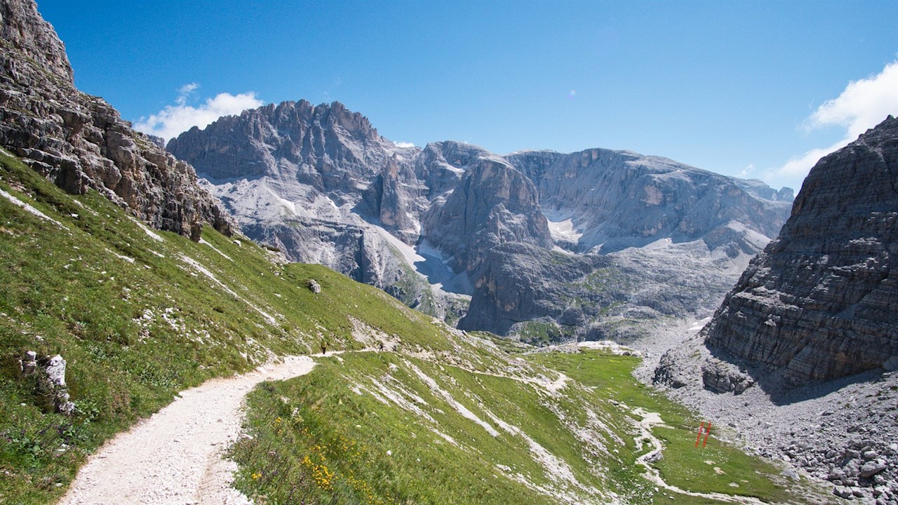 Hinter der Talschlusshütte folgt man weiterhin dem Weg Nr. 102, von dem wenig später der Wandersteig Nr. 103 in Richtung Zsigmondyhütte abzweigt. Vor der imposanten Kulisse der ringsum aufragenden Dolomiten steigt er recht steil über die teils latschenbewachsenen, stein- und felsdurchsetzten Hänge zu dieser einladenden Hütte am Fuße des trutzigen Zwölferkofel an.