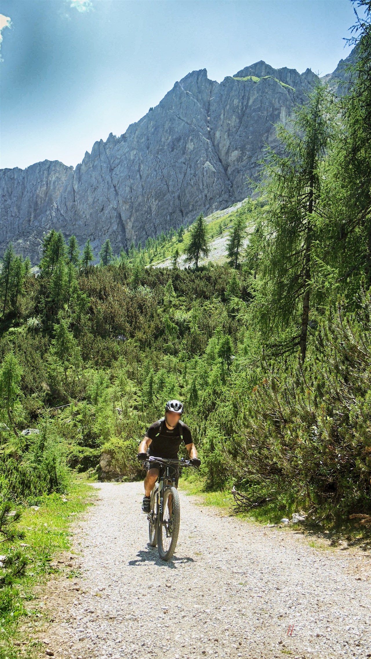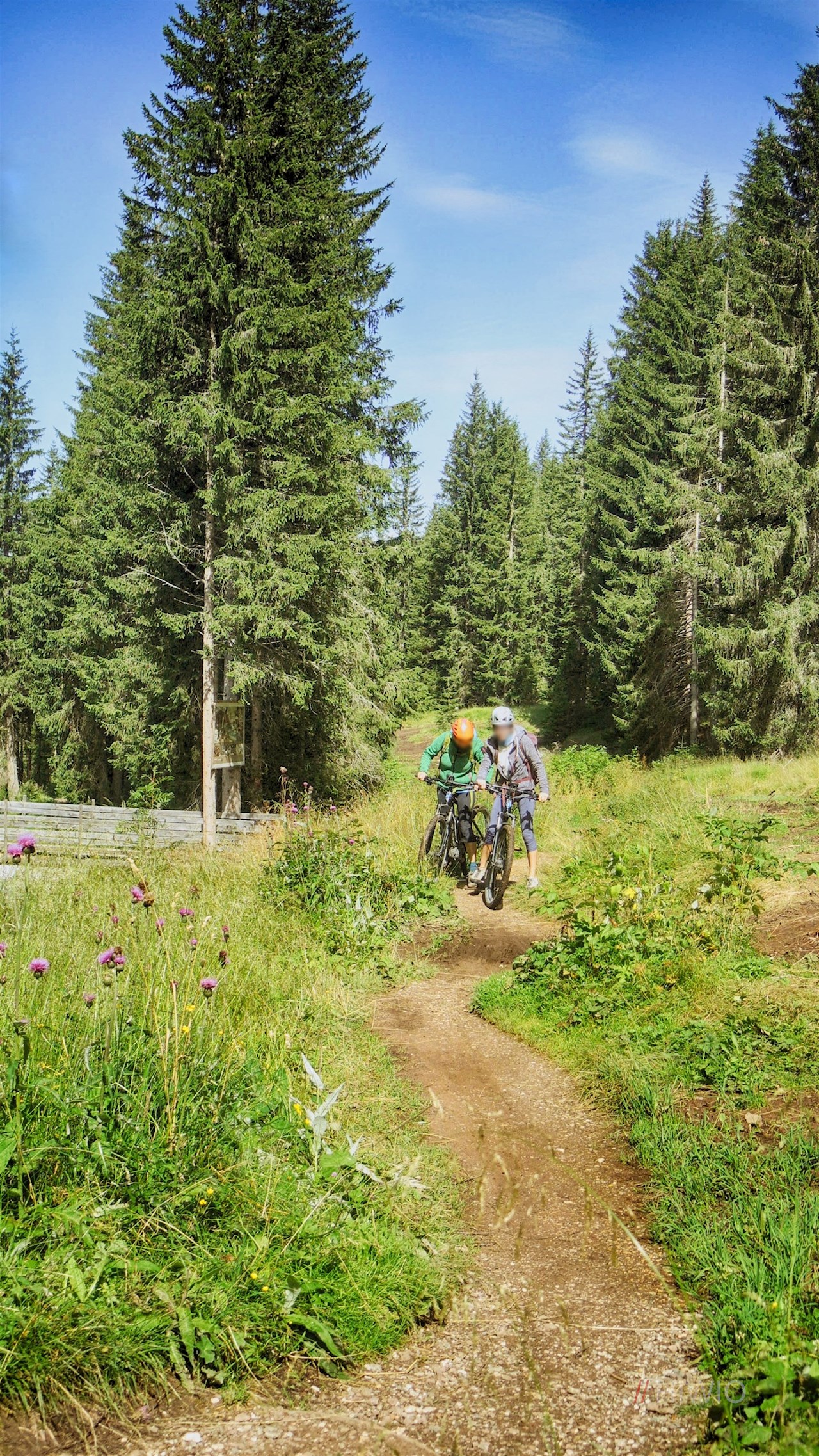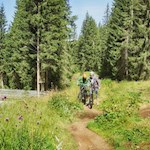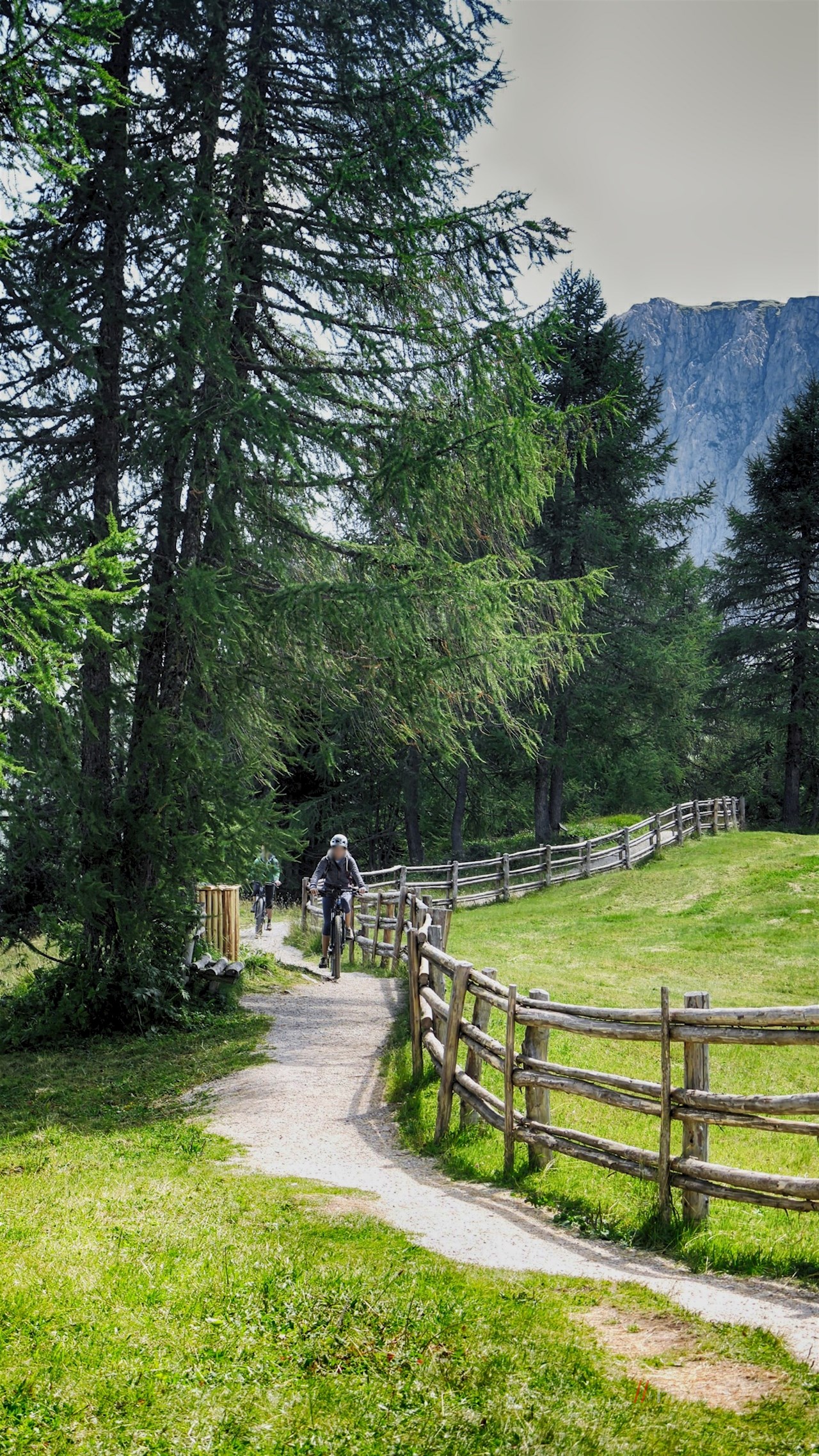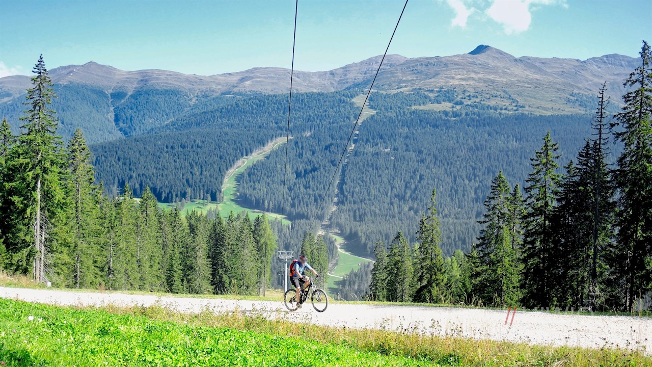 Nach ca. 500 Metern biegen wir links zur Talstation Signaue hinab und fahren sodann in einem spannenden Mix aus Trails, Wald- und Wiesenwegen bis zum Kreuzbergpass, der natürlichen Grenze zwischen Südtirol und dem Veneto.