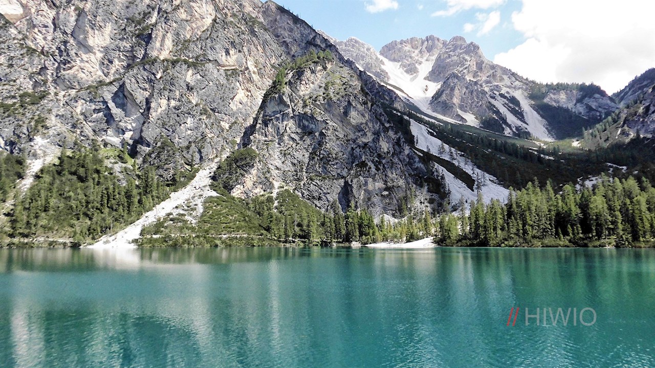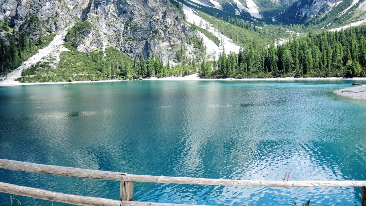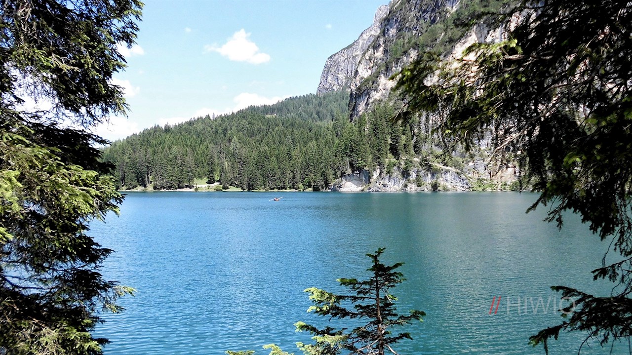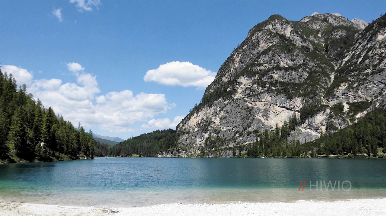 Dort nehmen wir für die letzten 2 km nochmals die Hauptstraße. Dieser Abschnitt verlangt dem Durchschnittsbiker nochmals alles ab, doch der Pragser Wildsee entschädigt mit seinem kristallklaren Wasser für all die Mühen und wir werden belohnt mit einem einzigartigen Panorama inmitten der Dolomiten. Wer die Uferseiten erkunden möchte, muss dies zu Fuß tun - die Uferwege sind für Radfahrer gesperrt.