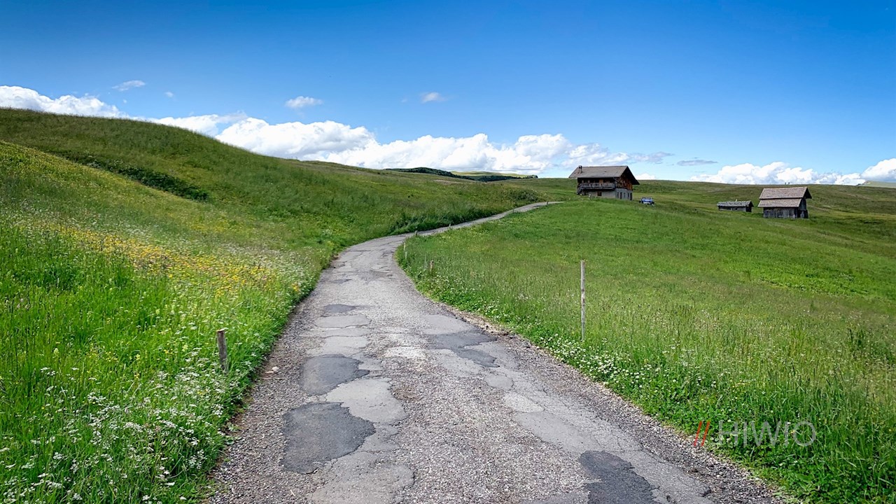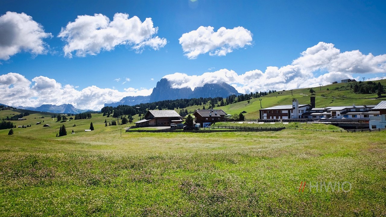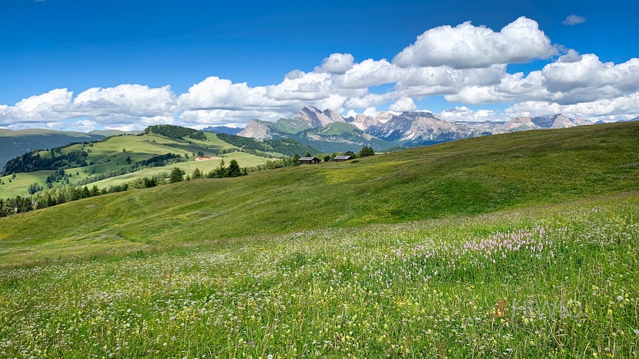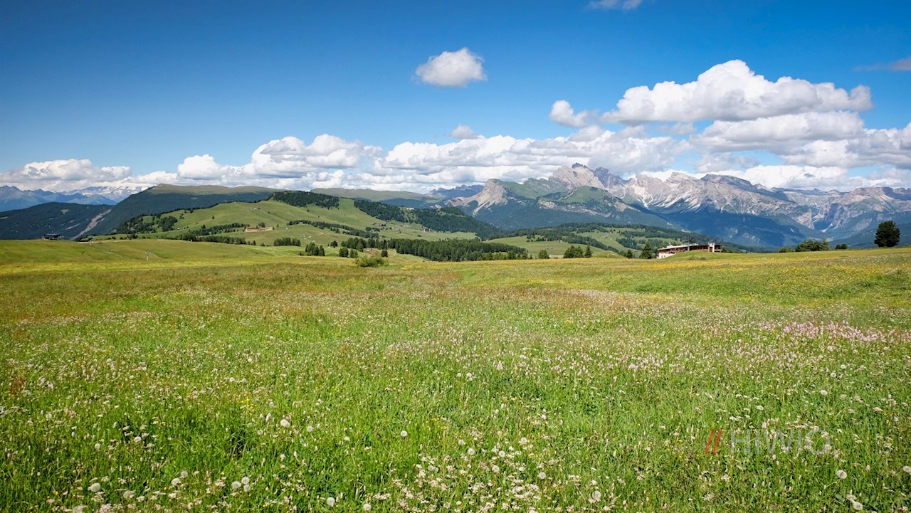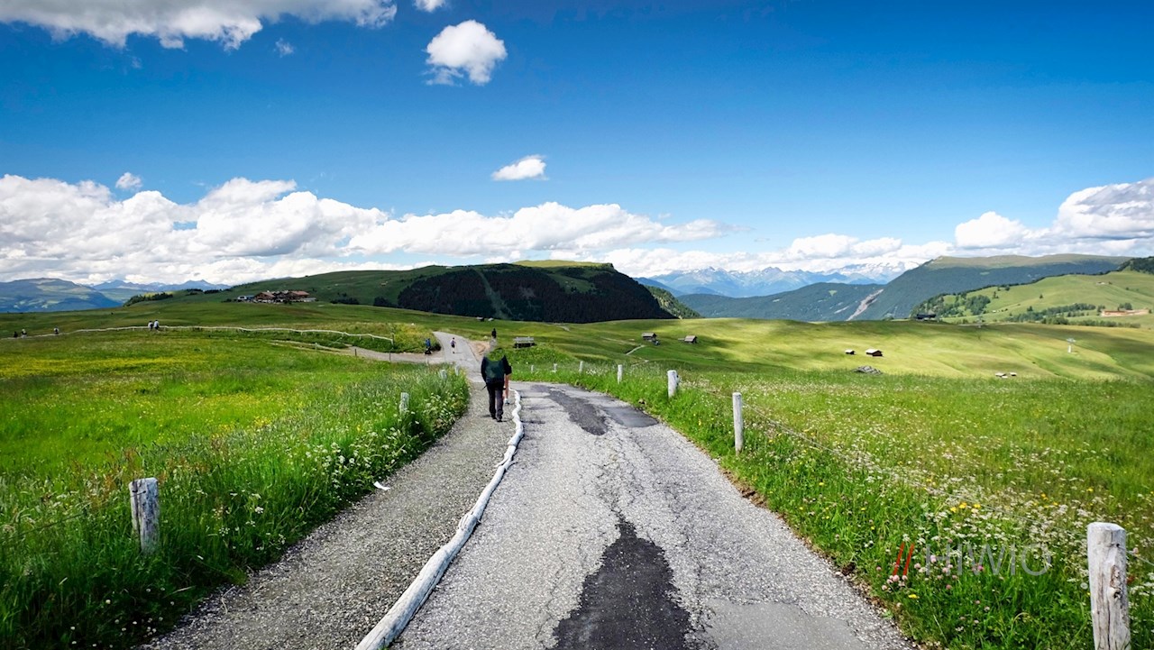 Unterhalb der Bergstation weist das Wanderschild Nr. 7 den Weg zur Edelweißhütte. Er schlängelt sich im angenehmen Anstieg durch die malerischen Almwiesen, in denen im Frühsommer eine bunte Vielfalt wohltuender Kräuter und Blumen gedeiht. Die sanft gewellten Almwiesen stehen in bezauberndem Kontrast zu den dahinter aufragenden Dolomiten, von denen insbesondere der Schlern und die Langkofelgruppe die Wanderer in ihren Bann ziehen.
