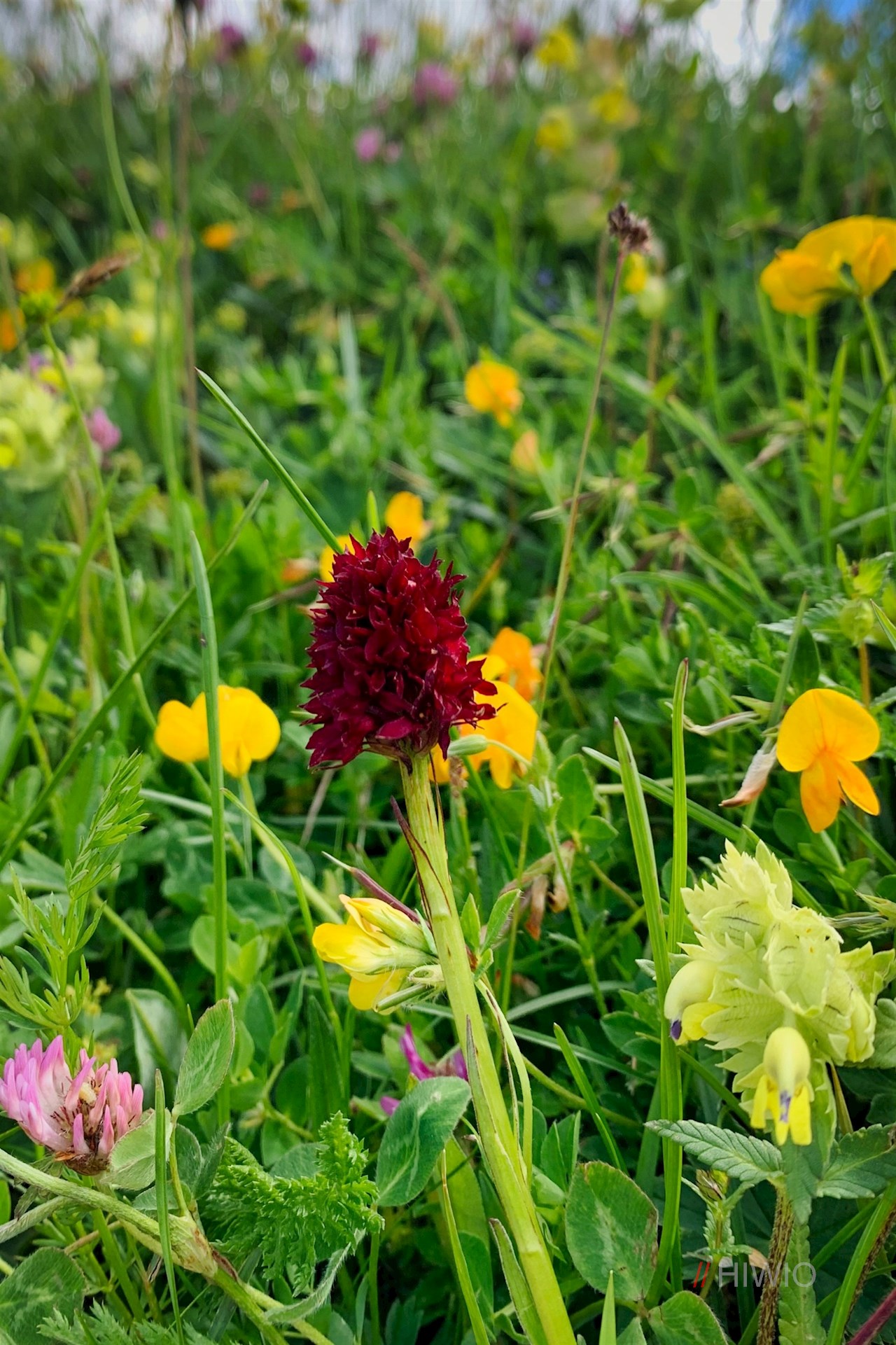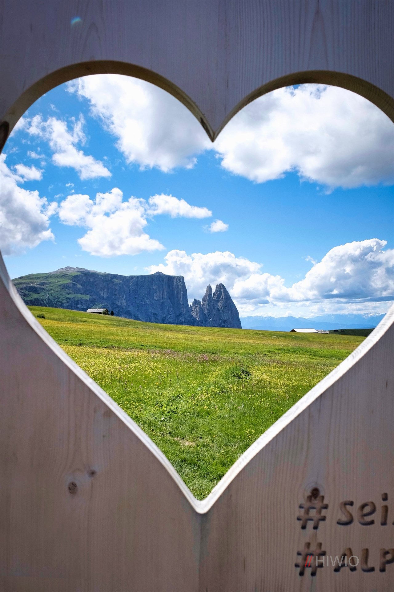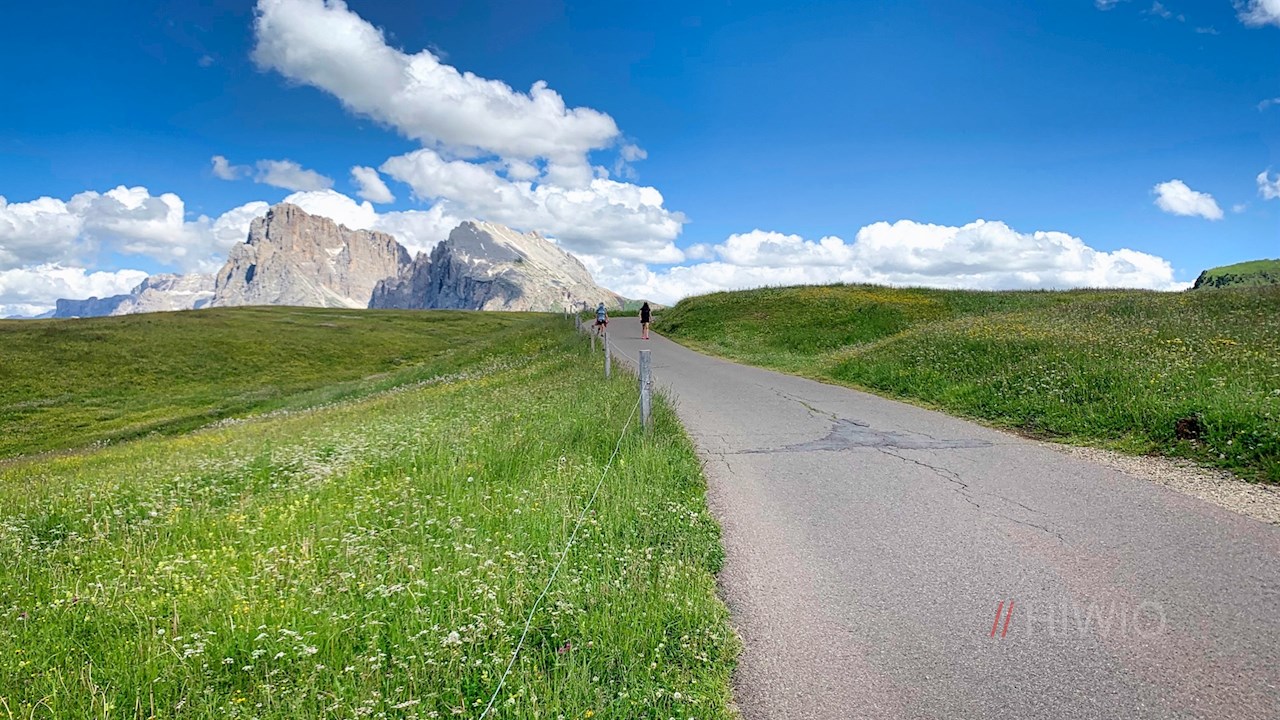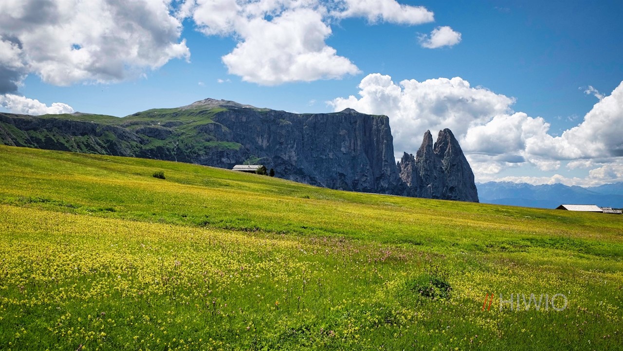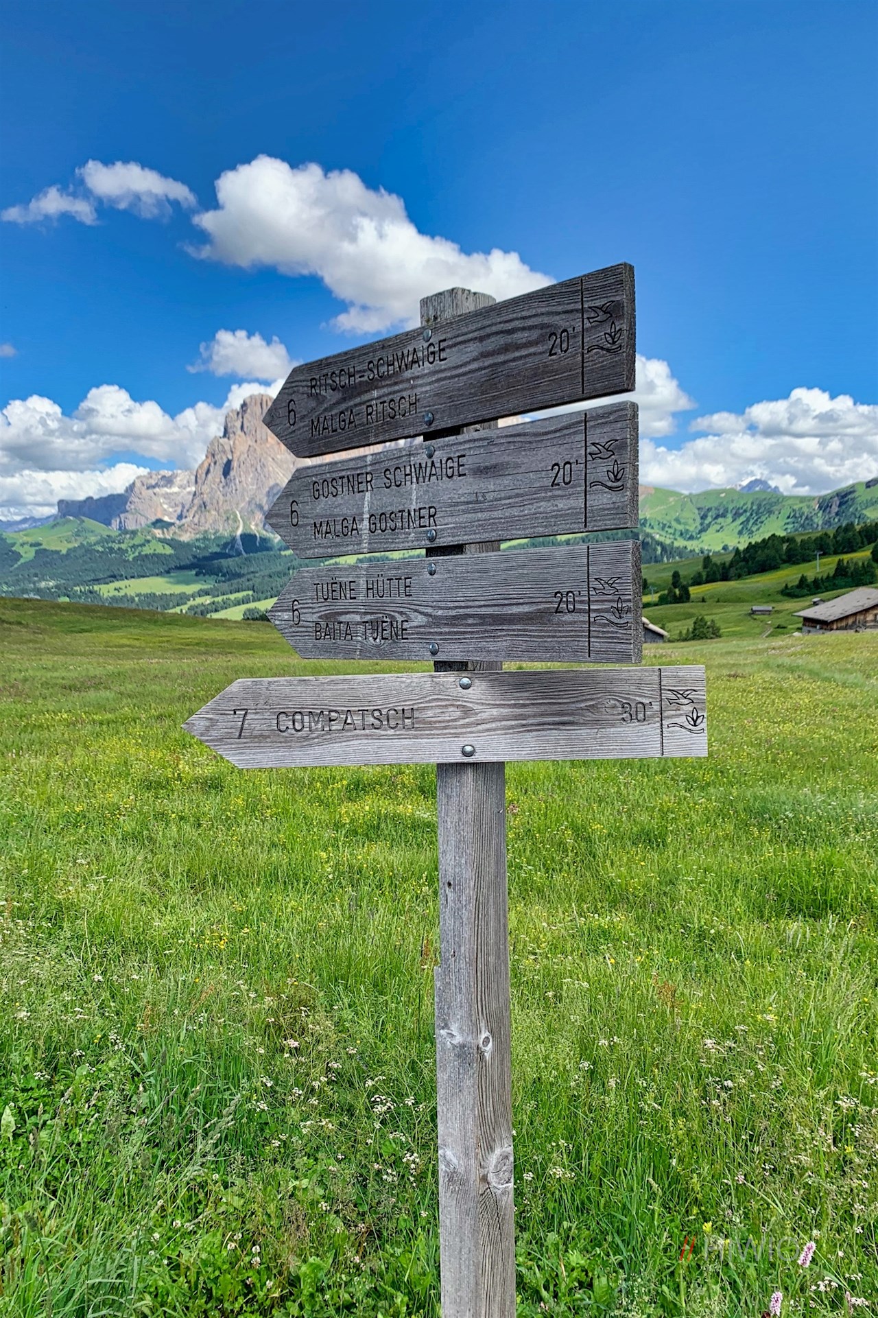 Unterhalb der Bergstation weist das Wanderschild Nr. 7 den Weg zur Edelweißhütte. Er schlängelt sich im angenehmen Anstieg durch die malerischen Almwiesen, in denen im Frühsommer eine bunte Vielfalt wohltuender Kräuter und Blumen gedeiht. Die sanft gewellten Almwiesen stehen in bezauberndem Kontrast zu den dahinter aufragenden Dolomiten, von denen insbesondere der Schlern und die Langkofelgruppe die Wanderer in ihren Bann ziehen.