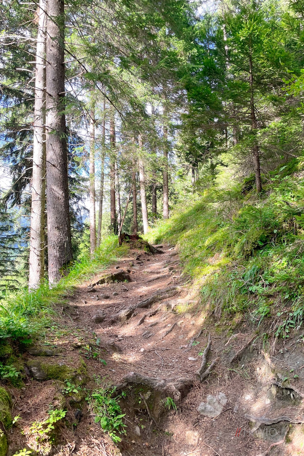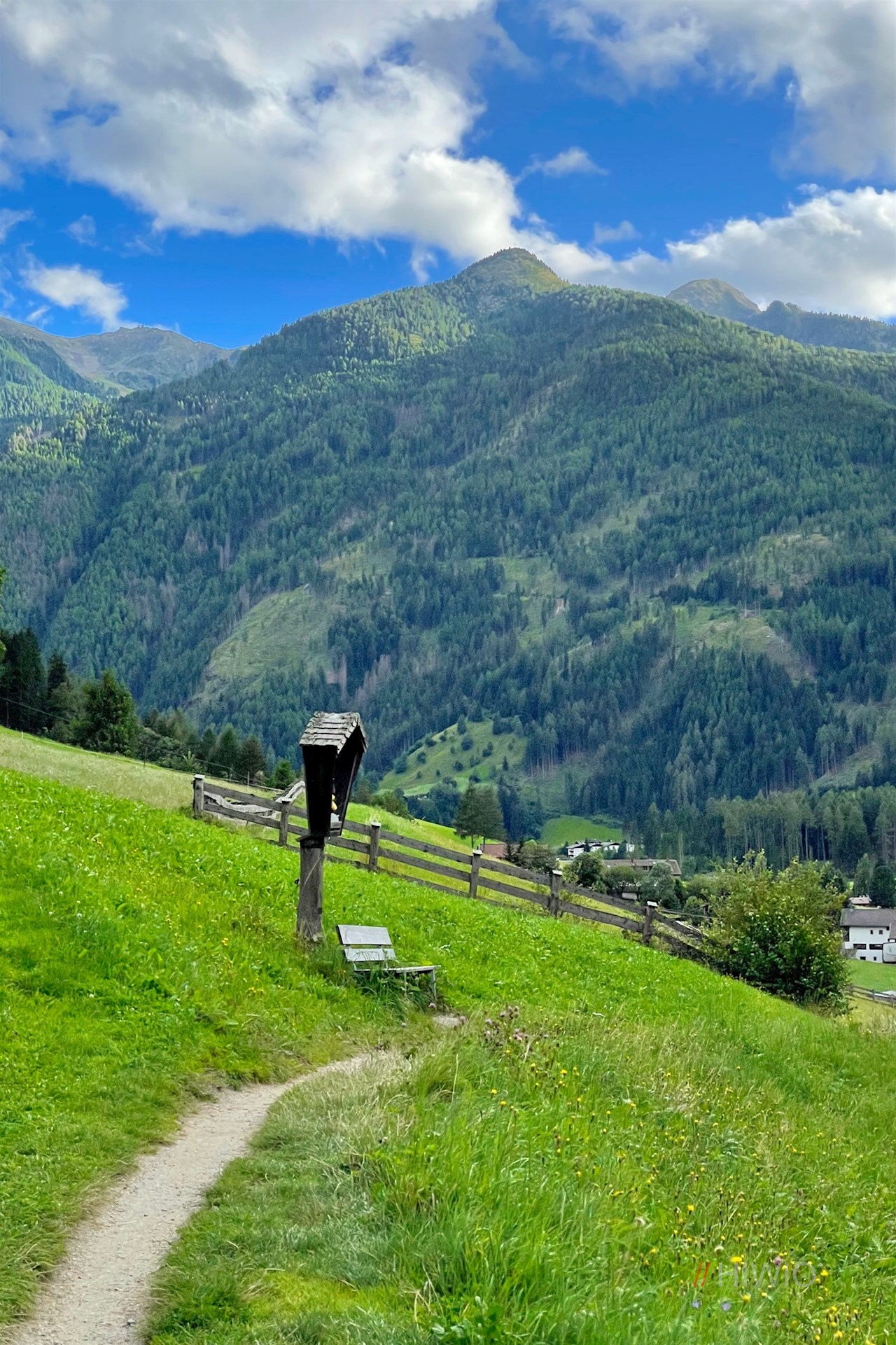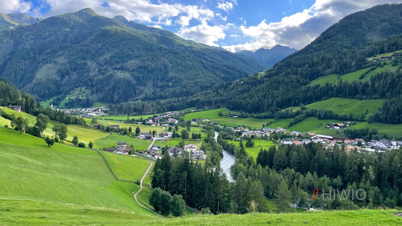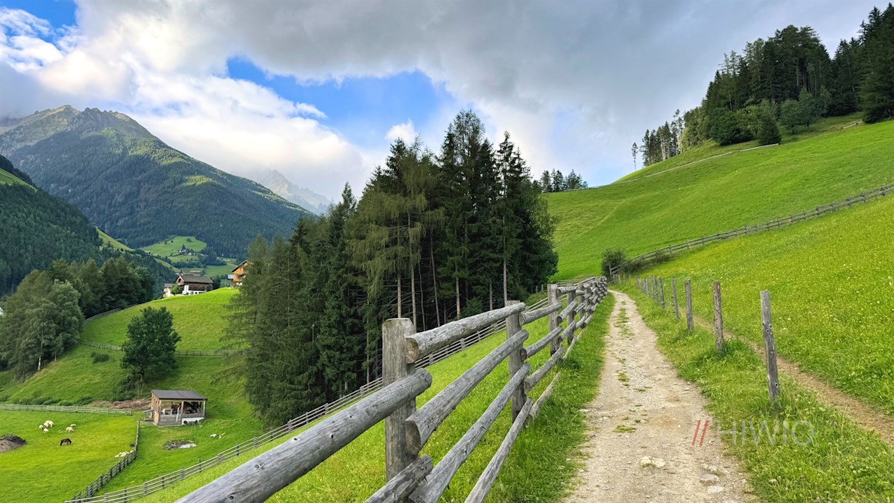 Dieses schlängelt sich im sanften Anstieg nach oben und öffnet dabei schöne Ausblicke ins Tal und auf die gegenüberliegenden Berge, von denen vor allem der Speikboden, der Schönberg, der Wolfskofel und der Kreuzkofel ins Auge stechen.
