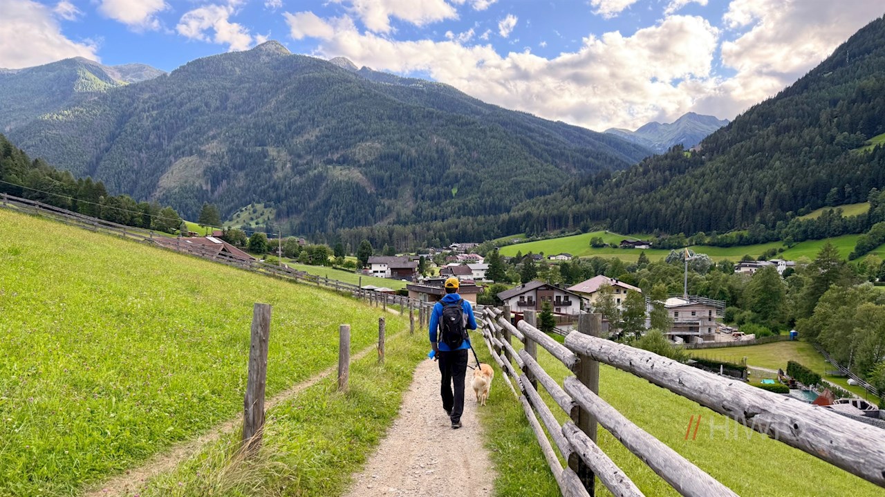 Es schlängelt sich zu einigen Häusern hinab, bei denen der Ahrntaler Talweg nach Luttach abzweigt. Dieser führt durch aussichtsreiche Wiesen an einigen Häusern und einem Hirschgehege vorbei zum Ausgangspunkt zurück.