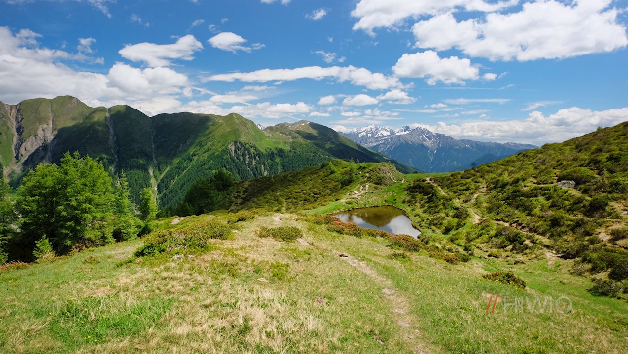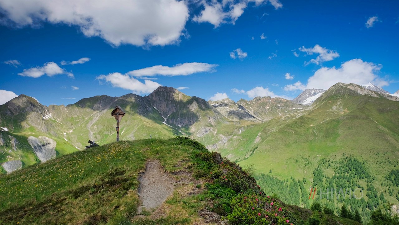 Neben dem anmutigen Gipfelkreuz des Eggespitz entfaltet sich wenig später ein atemberaubend schöner Ausblick auf die ringsum aufstrebenden Berge, von denen namentlich die schneeweiße Gletscherwelt um den Weißzint, den Großen Möseler und den Turnerkamp den Betrachter in ihren Bann schlägt. Aussichtsbänke laden zum Verweilen und Genießen dieser traumverlorenen Idylle ein.