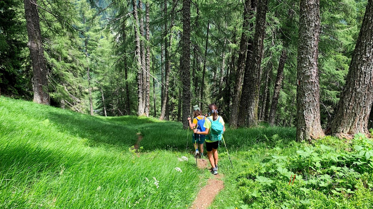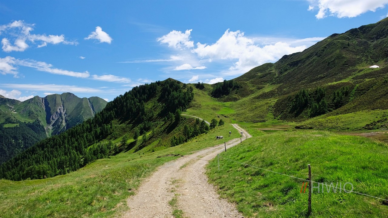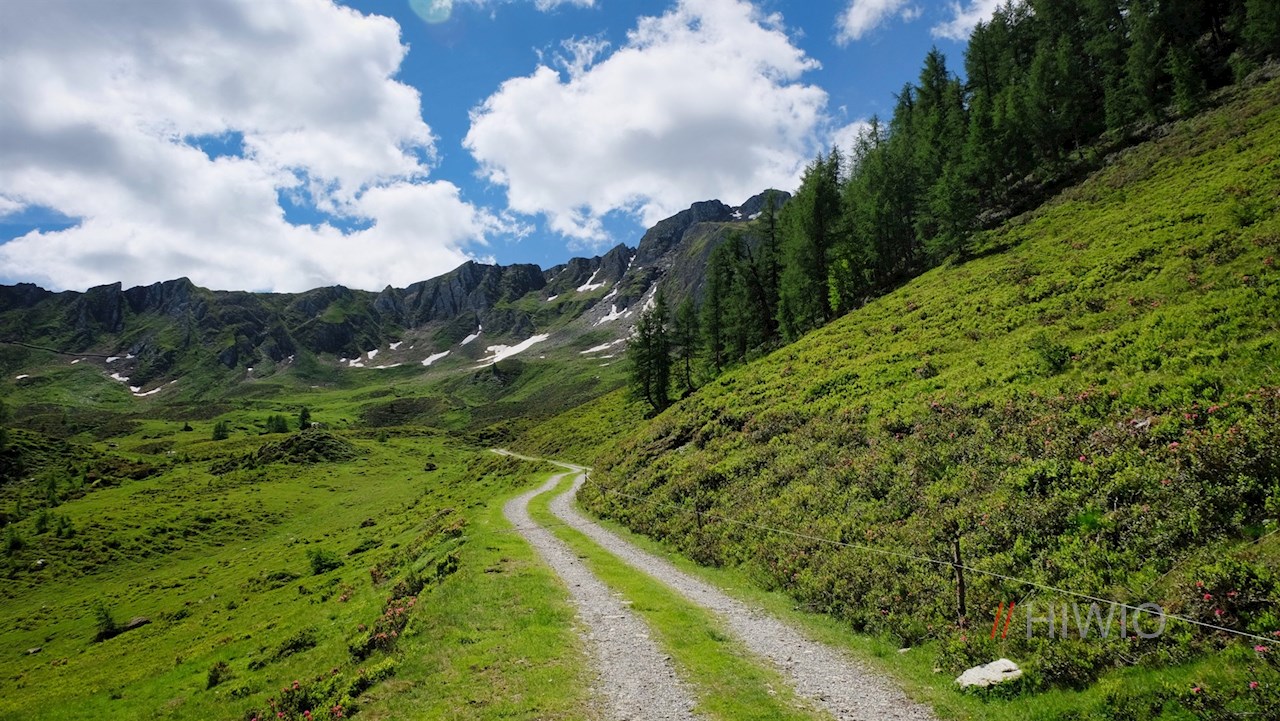 Vom Parkplatz Zösenberg führt der breite, sanft ansteigende Wanderweg Nr. 20A zunächst zur nahen Mair am Tinkhof Alm, hinter der er alsbald den kleinen Zösenbach überquert. Sodann schlängelt er sich durch idyllische, von hochaufragenden Bergen umrahmte Weidewiesen, in denen im Frühsommer unzählige, im warmen Tiefrosa leuchtende Alpenrosen gedeihen.