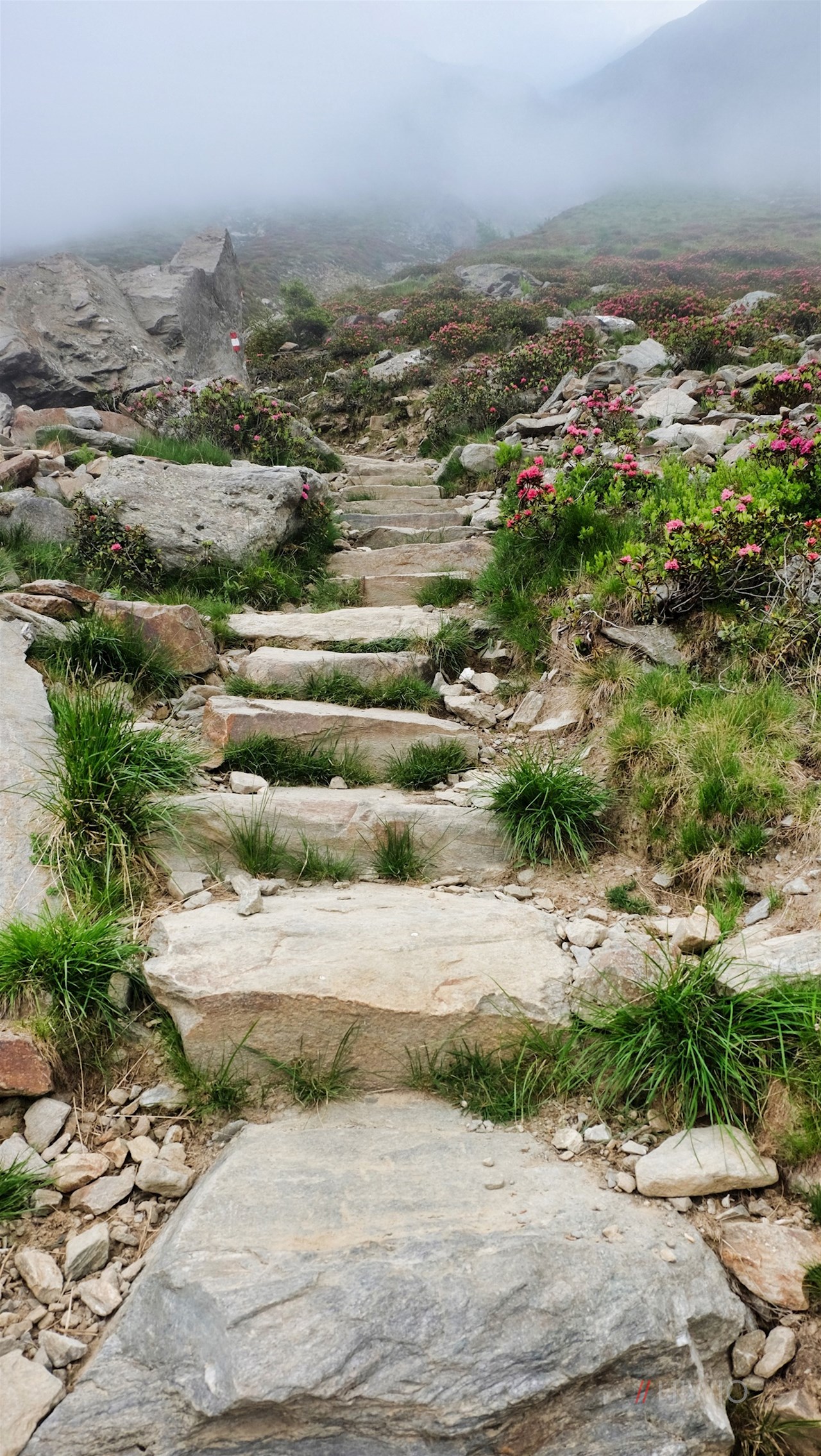 Nun wird der Weg allmählich steiler und geht schließlich in einen schmalen Pfad über, der sich durch blumenfrohe, von Alpenrosen geprägte Almwiesen zum kleinen Tiefrastenhüttl emporschlängelt. Dahinter wird der Weg erstmals flacher, steigt aber alsbald wieder in Richtung Tiefrastenhütte an.