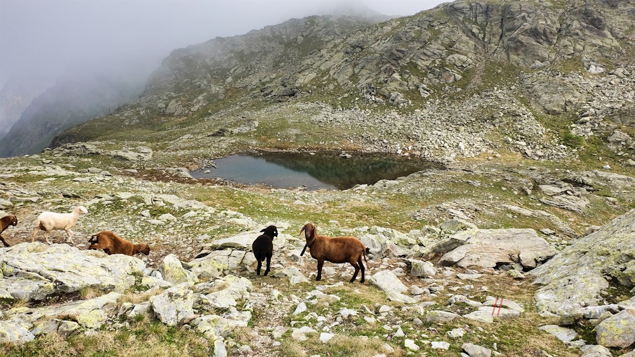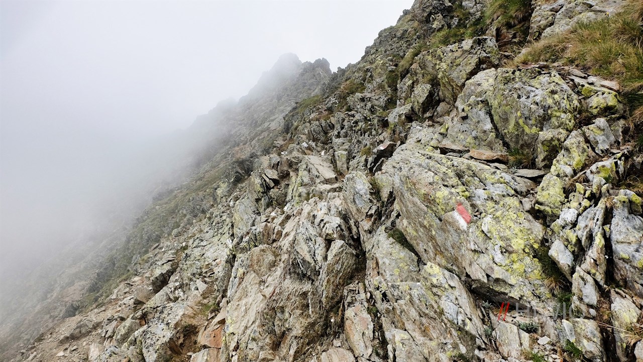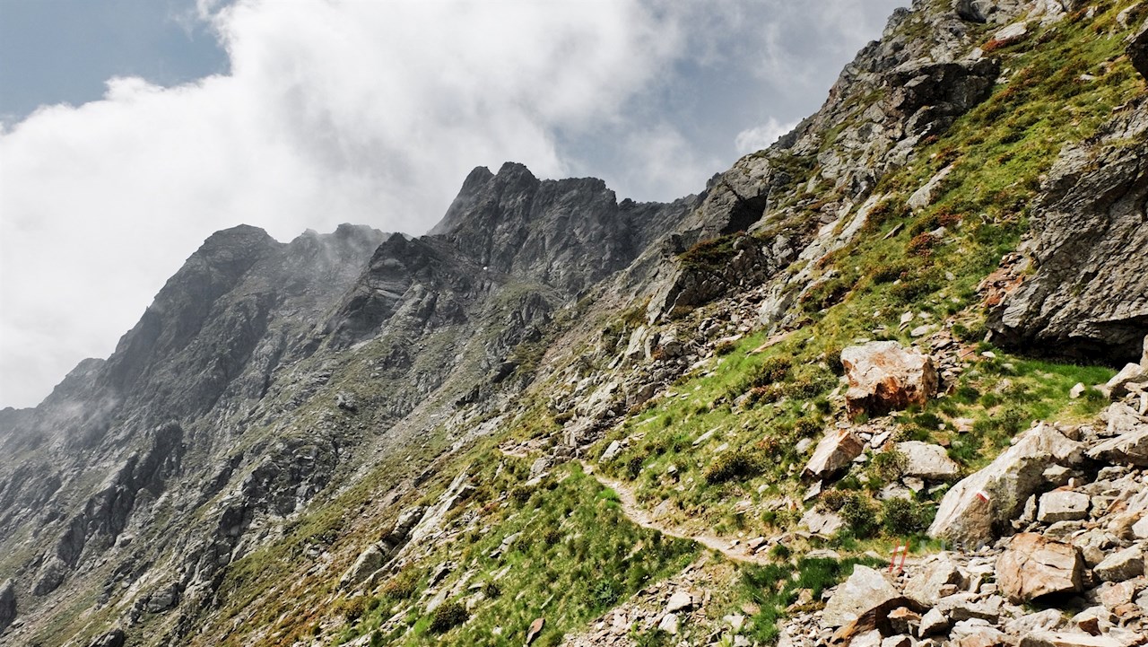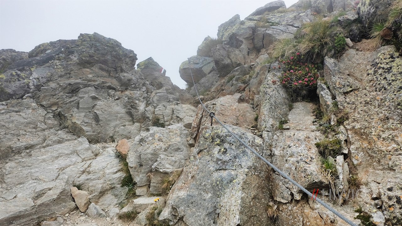 Dahinter windet sich der nunmehr sanfter ansteigende Weg durch teils felsendurchsetztes, ausgesetztes und abschüssiges Gelände an weiteren kleinen Bergseen vorbei. Außerdem trifft man auf einen weiteren seilgesicherten Abschnitt. Schließlich beginnt der recht steile Anstieg über die schrofige, von zarten Alpenblumen bewachsene Gipfelflanke der Eidechsspitze.