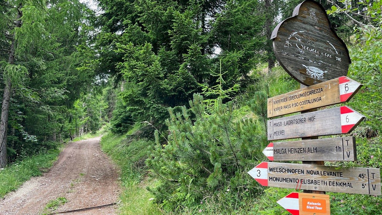 Am Parkplatz ist die Wanderung zum Elisabeth Denkmal bereits ausgeschildert. Sie führt wenig später am Grand Hotel Karersee vorbei, in dem Kaiserin Elisabeth im August des Jahres 1897 weilte. Von hier aus unternahm sie ausgedehnte Spaziergänge, zu denen auch der nach ihr benannte, mit der Wegnummer 6 ausgeschilderte Spaziergang auf der Elisabethpromenade gehörte.