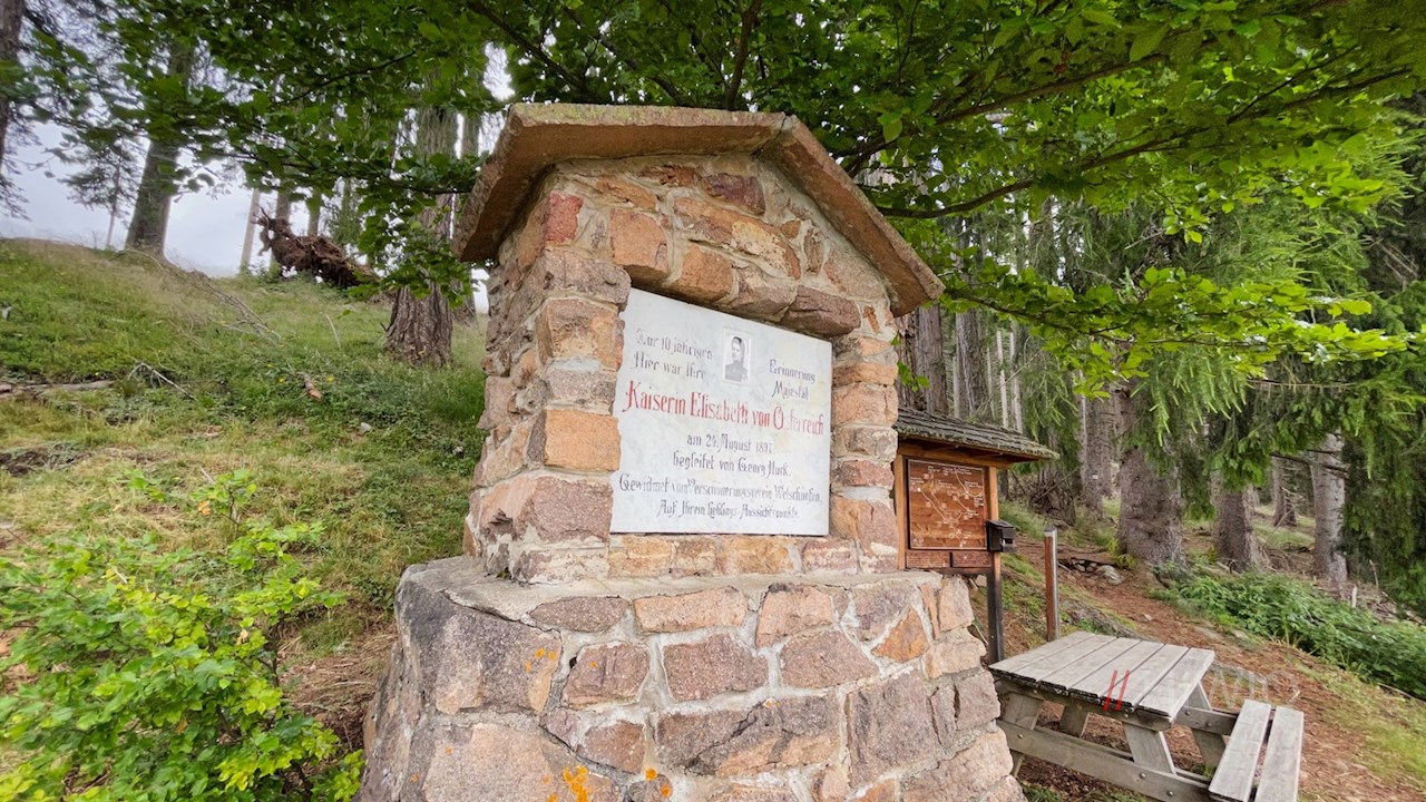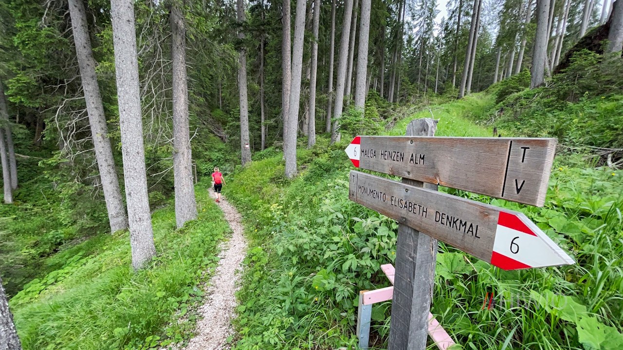Am Elisabeth Denkmal endet die Elisabethpromenade. Statt den Rückweg auf dem Hinweg anzutreten, wandern wir zur letzten Weggabelung zurück, an der das Wanderschild Nr. 6 den Weg zur Heinzen Alm weist.