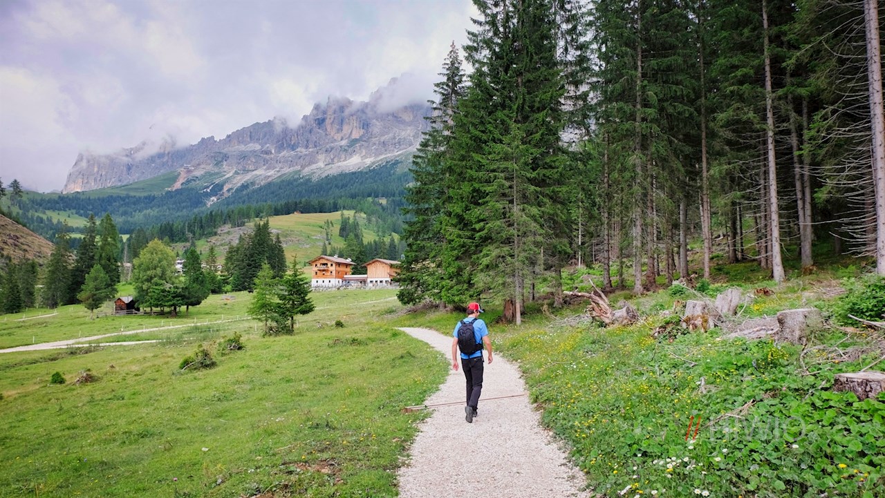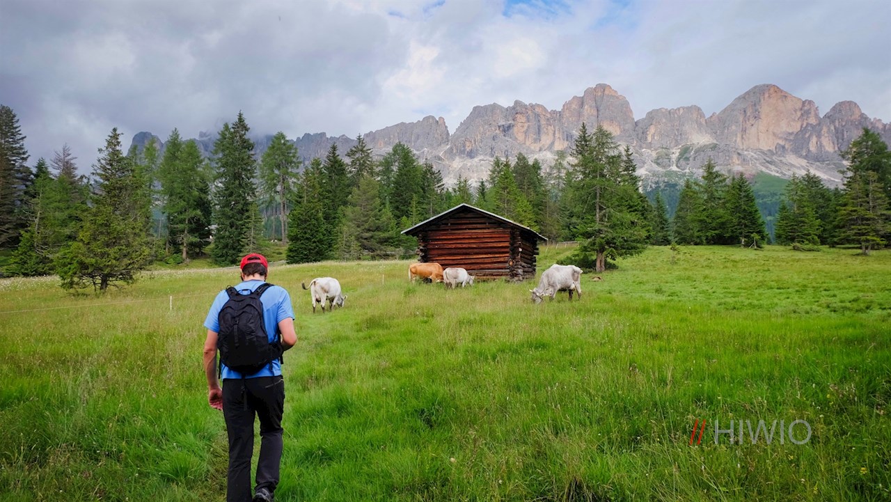 Er führt teils eben, teils leicht ansteigend durch den friedvollen Nadelwald, in dem das Sturmtief Vaia im Jahre 2018 deutliche Spuren hinterlassen hat. Nach einer weiteren Stunde gemütlichen Wanderns präsentiert sich die schindelbedeckte Heinzen Alm inmitten malerischer Almwiesen. Mit Blick auf die nahen Felswände des majestätischen Rosengarten werden die Wanderer mit frisch zubereiteten Südtiroler Gerichten, hausgemachtem Joghurt und Kuchen verwöhnt.