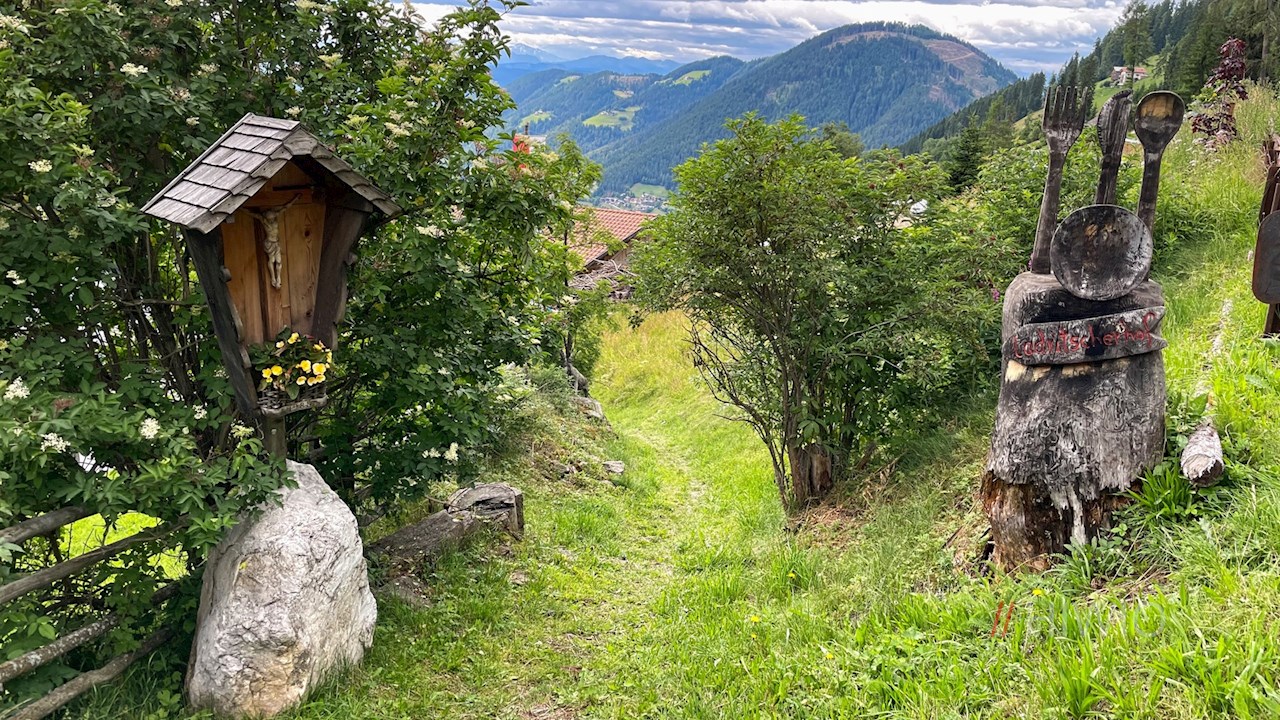 Er führt im leichten Auf und Ab durch lichte Waldstücke und Weidewiesen am Fuße des Rosengarten und geht nahe einer Getreidemühle in die asphaltierte Schönblickstraße über.