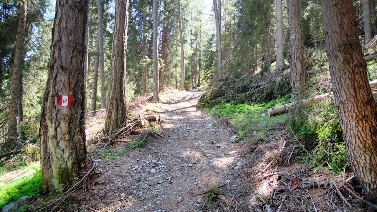 Schließlich zweigt rechts der Weg Nr. 67B ab, der wenig später in einen breiten Forstweg übergeht. Auf diesem gelangt man zum Ausgangspunkt zurück.
