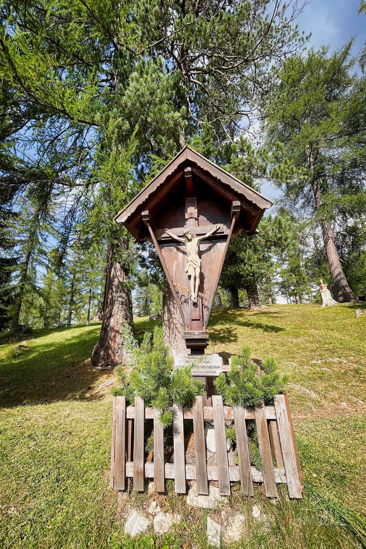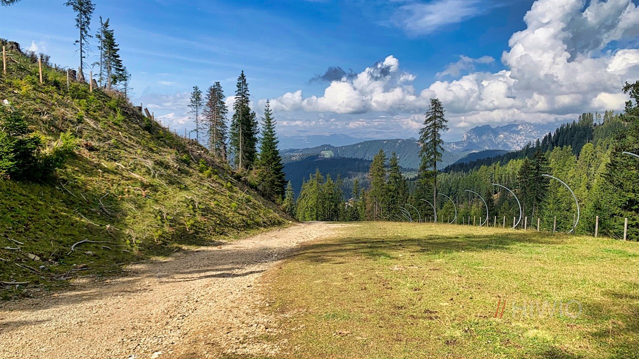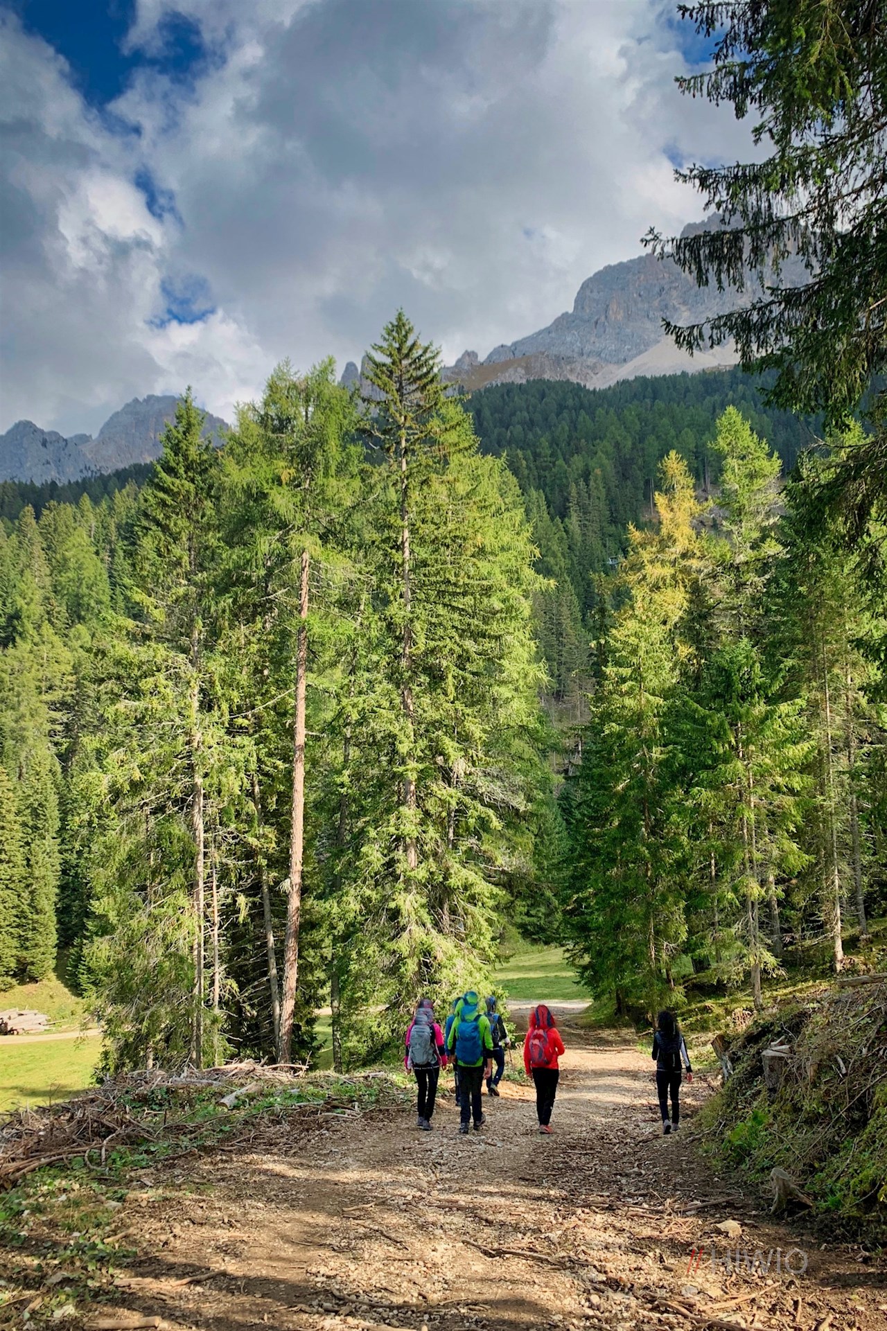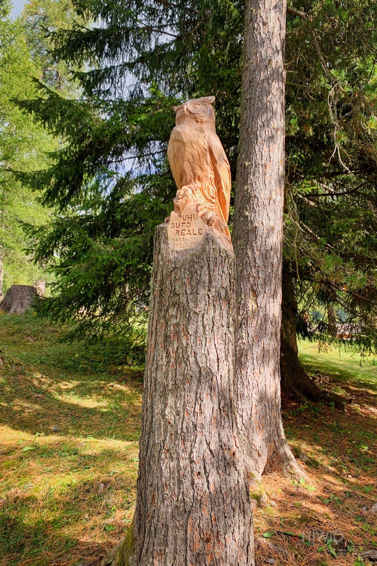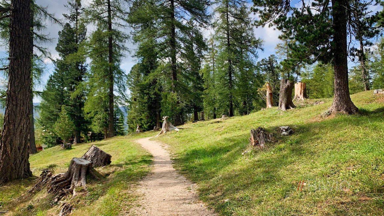 Am oberen Parkplatz zweigt der Wanderweg Nr. 9 zu den Eggentaler Almen ab. Er führt zunächst durch das lichtdurchflutete, von anmutig geschnitzten Holztieren geschmückte „Lärchenwaldele“ und geht hinter dem Hotelkomplex in eine breite Forststraße über.