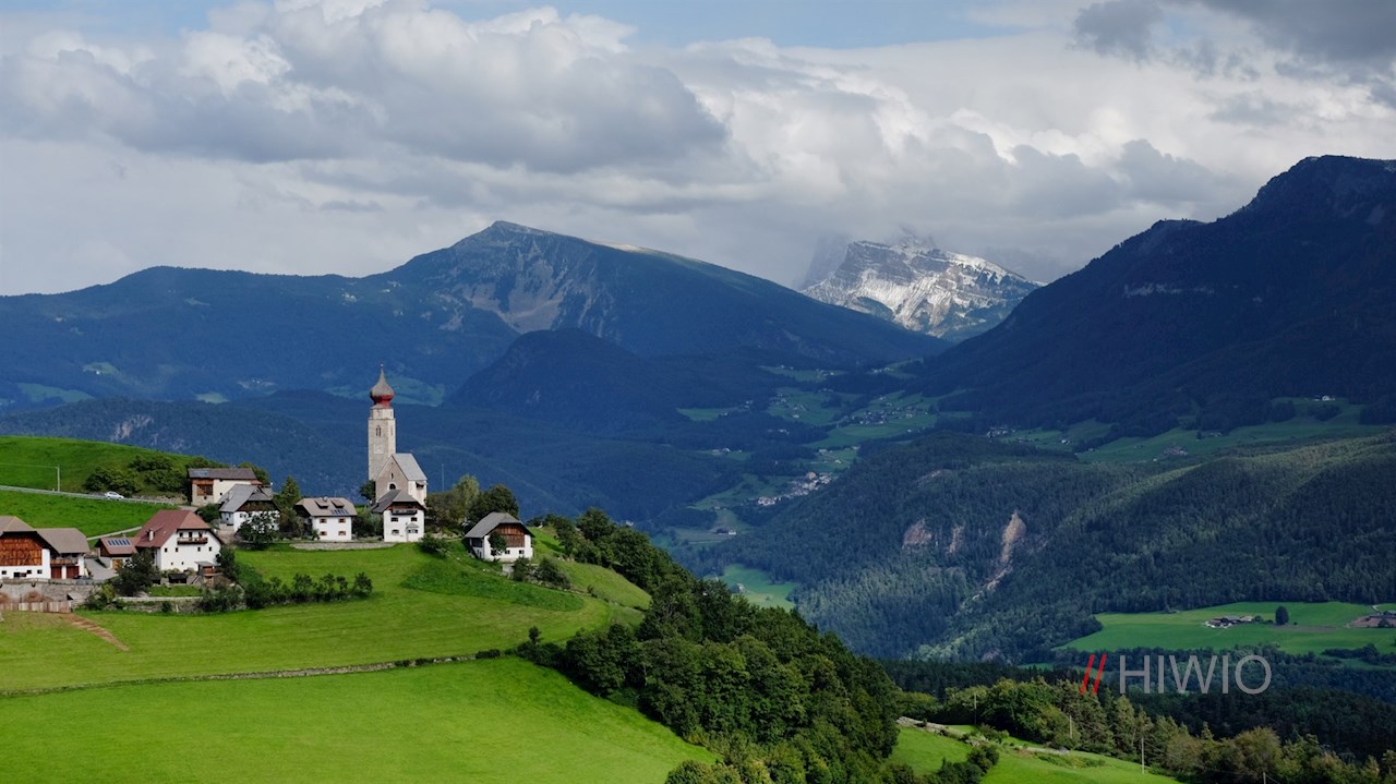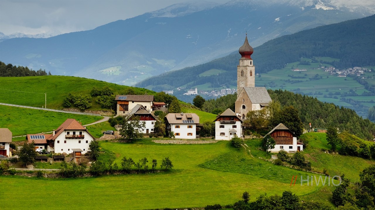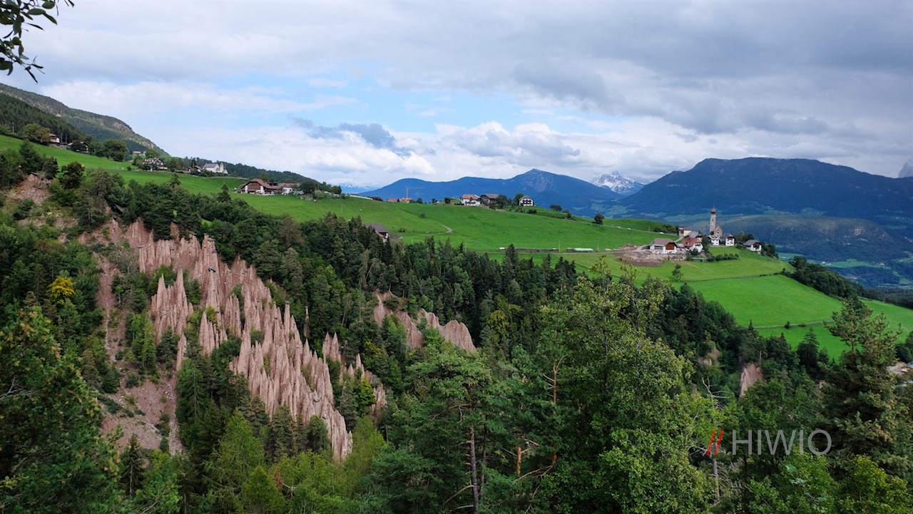 Er führt im leichten Abstieg zu einer hölzernen Aussichtsplattform hinab, auf der sich ein atemberaubend schöner Ausblick auf die rotbraunen Erdpyramiden des Finsterbaches entfaltet: Vor der Kulisse des verträumten Weilers Mittelberg mit der Nikolauskirche und der dahinter aufstrebenden Dolomiten ragen sie bis zu 30 Meter in die Höhe.