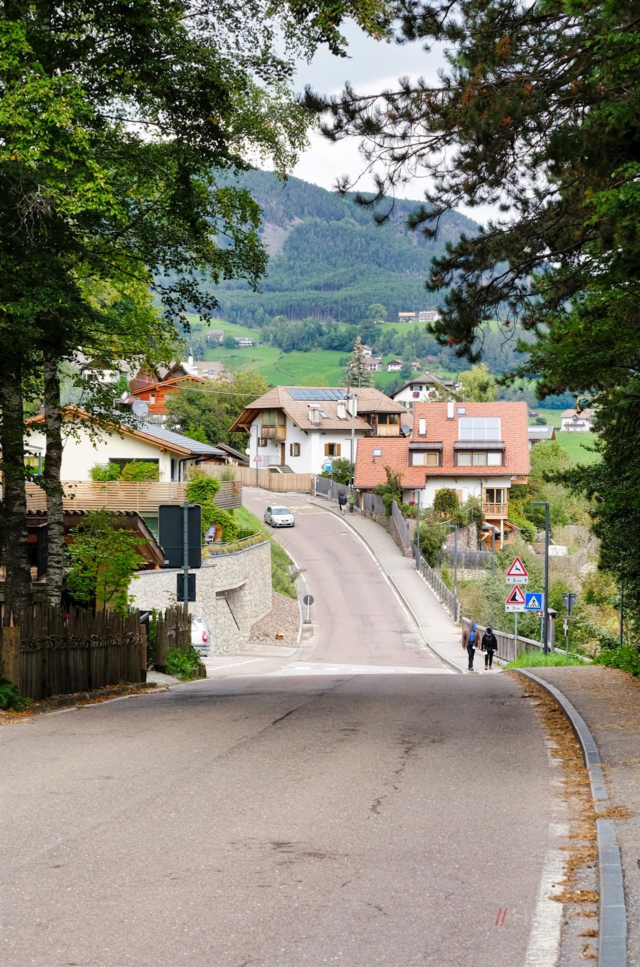 Die Wanderung zu den Erdpyramiden beginnt auf dem großen Parkplatz neben der Kommende in Lengmoos.