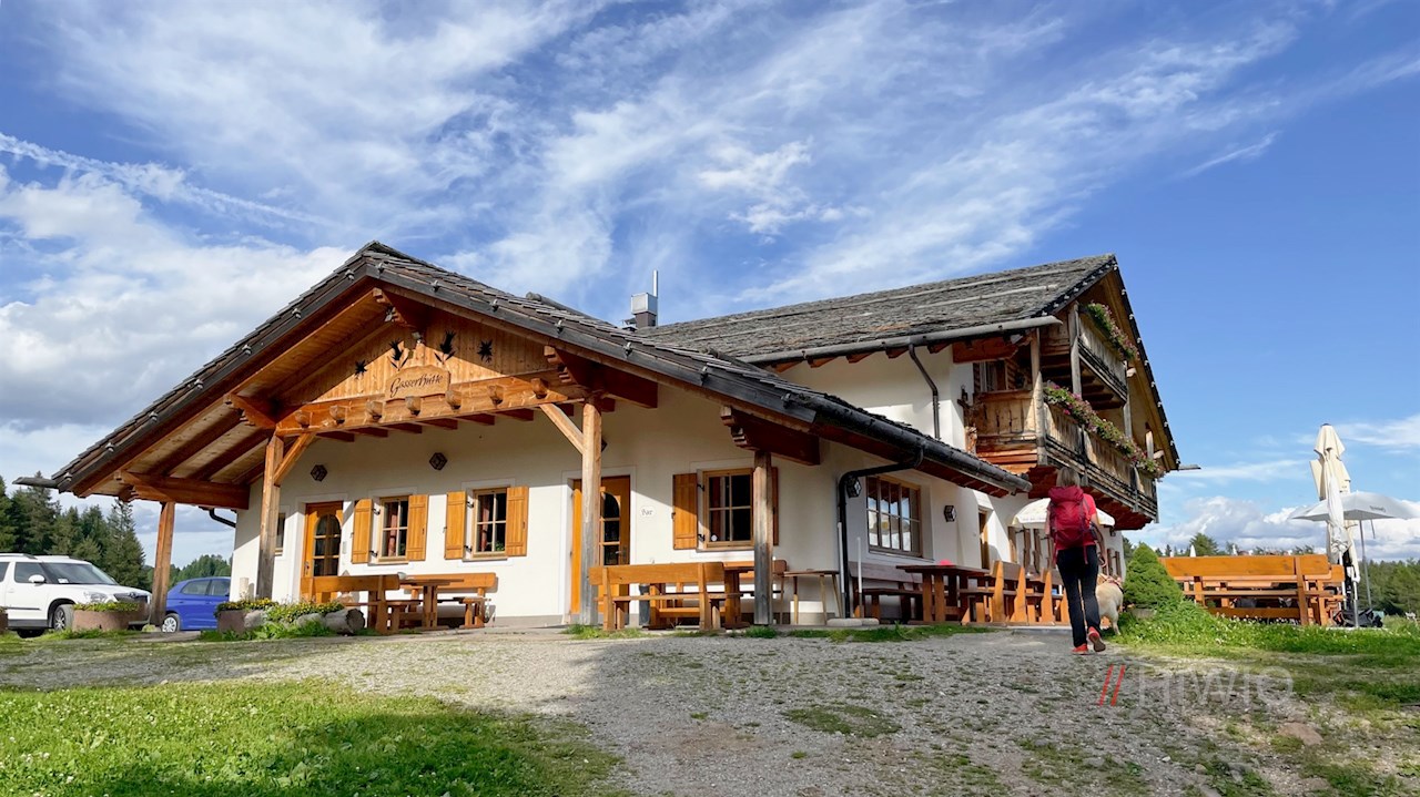 Nach etwa 25 Minuten gemächlichen Wanderns erreicht man den weitläufigen Wanderparkplatz Saltnerstein am Rande der Villanderer Alm, über dem die idyllisch gelegene Gasser Hütte zur Einkehr lädt.