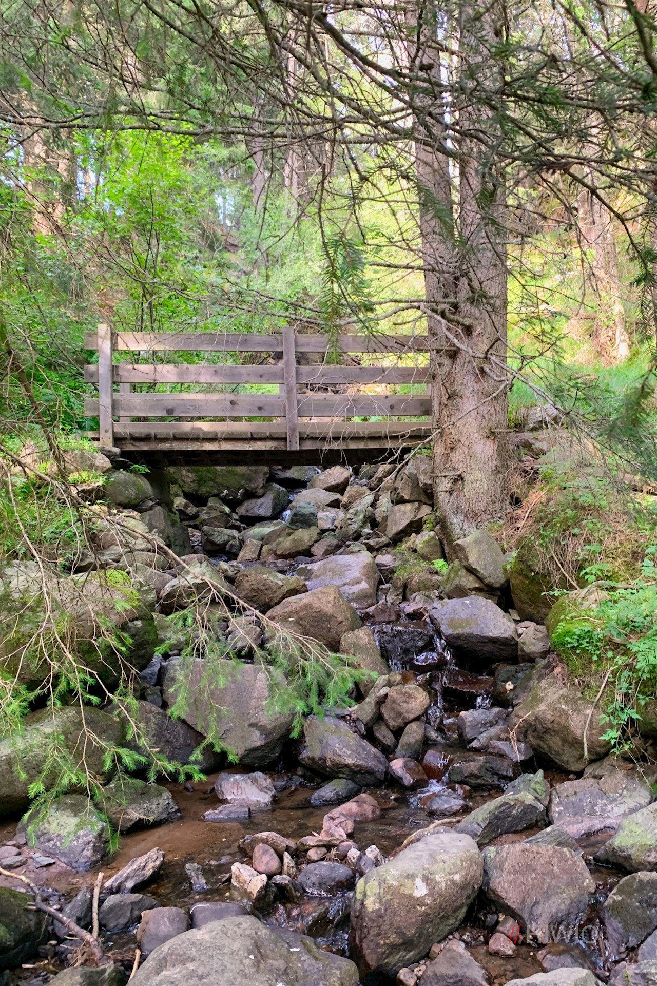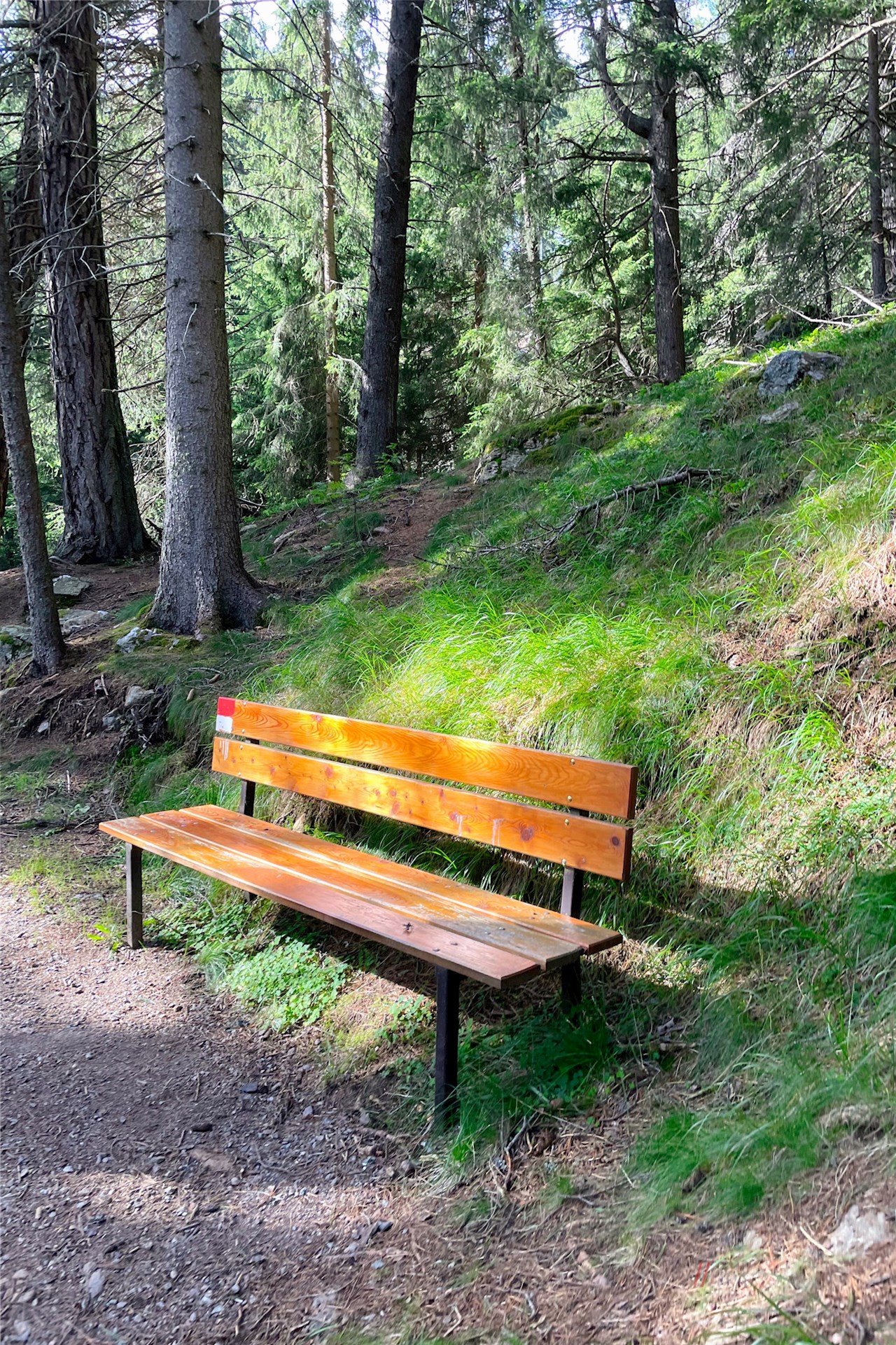 Der Wegnummer 7 in Richtung Villanderer Alm folgend, zieht sich der sanft ansteigende Wanderweg im Schatten hoher Bäume durch den friedvollen, von kleinen Bachläufen durchzogenen Wald.