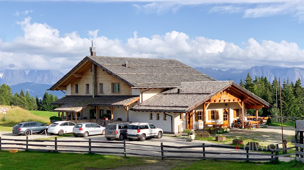 Auf der sonnenverwöhnten Panoramaterrasse und in den rustikalen Gaststuben sorgt das freundliche Hüttenteam vor der Kulisse der gegenüberliegenden Dolomiten für das leibliche Wohl seiner Gäste, die es mit verführerisch duftenden Südtiroler Gaumenfreuden verwöhnt.