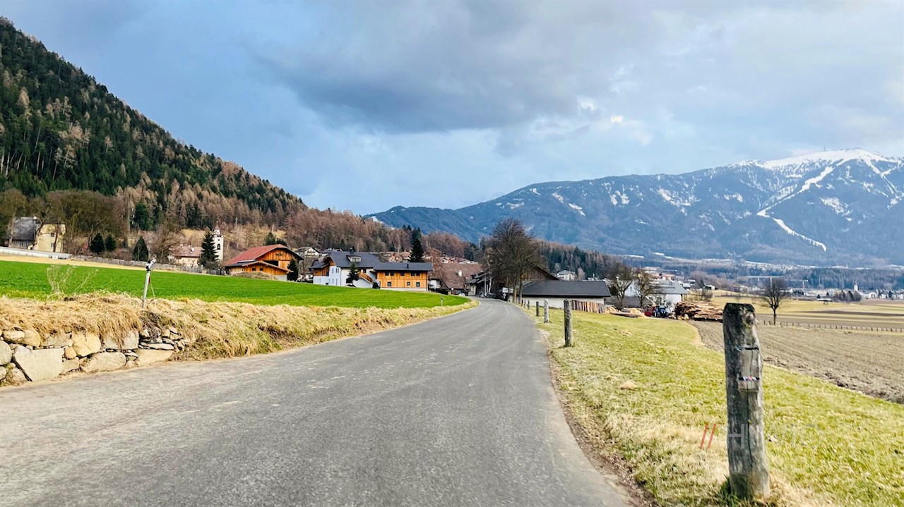 Der Feldweg selbst zieht sich durch den äußeren Dorfrand an der Kirche vorbei und geht dann in einen eben verlaufenden Radweg über.