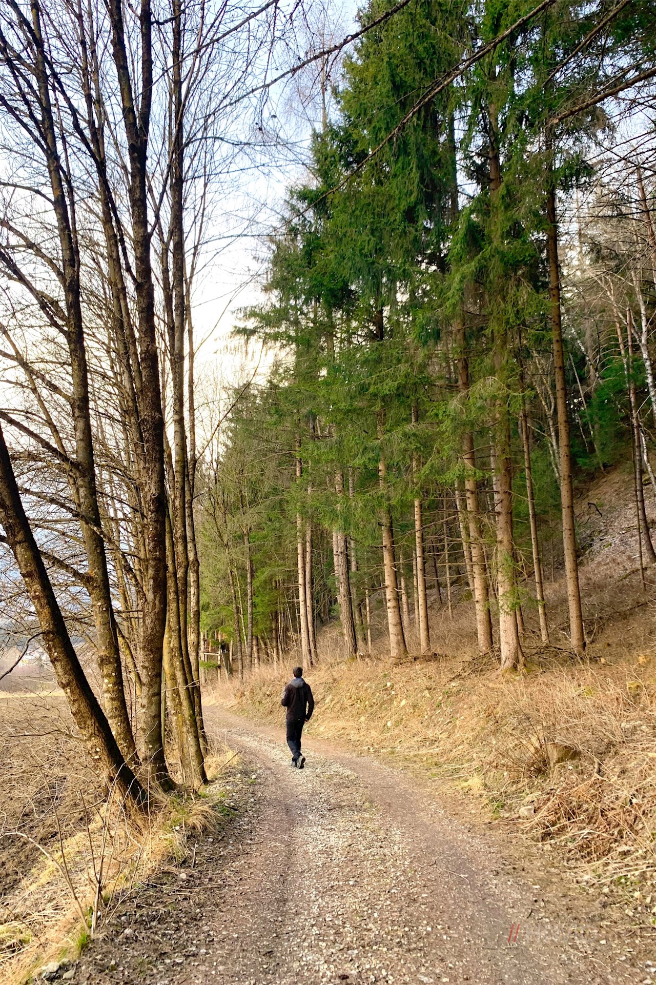 Sie führt im sanften Anstieg am Oberhoferhof vorbei und geht kurz darauf in einen breiten Wanderweg über. Dieser taucht in ein kleines Waldstück ein und fällt wenig später zwischen dem Waldsaum auf der einen und dem Feldrand auf der anderen Seite ins bereits sichtbare Gais ab.