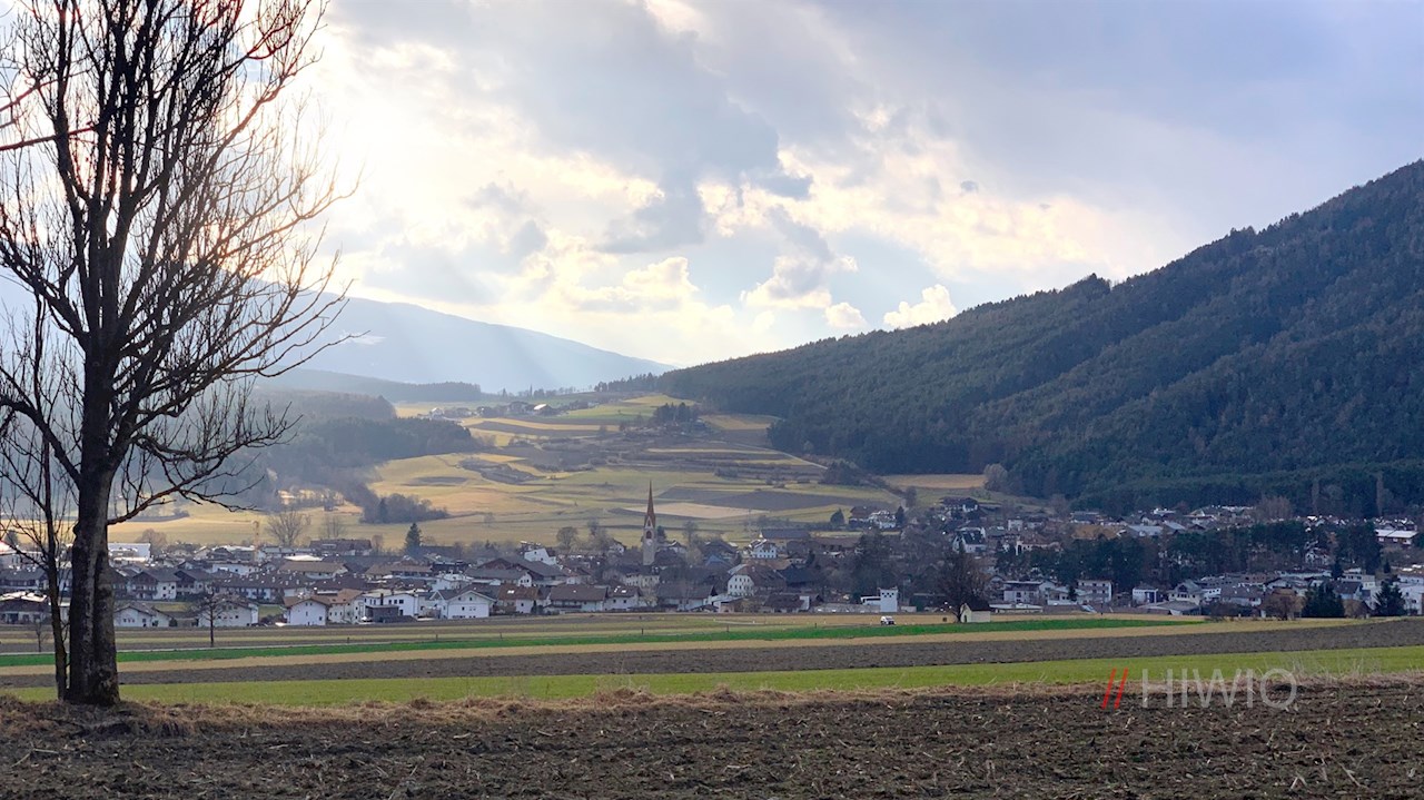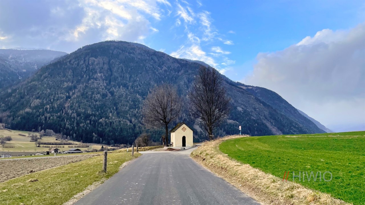 Die Wanderung auf dem Feldweg nach Gais beginnt im sonnenverwöhnten Dorf Aufhofen bei Bruneck. Um die Feuerwehrhalle finden sich einige Parkplätze.
