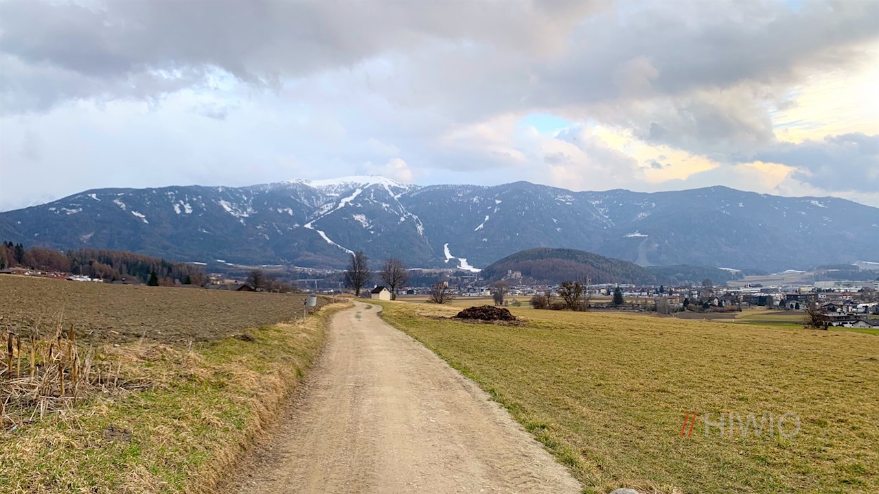 Der Feldweg von Aufhofen nach Gais führt in einem weiten Bogen durch Felder, Wiesen und Wälder und öffnet dabei schöne Ausblicke auf die Kehlburg, Schloss Neuhaus, St. Georgen und die ringsum aufragenden Berge.