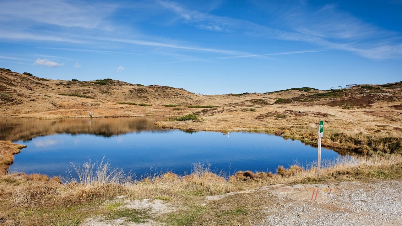 Vom Wanderparkplatz führt der sanfte Schotterweg Nr. 12A vor der beeindruckenden Kulisse der umliegenden Bergwelt in Richtung Flecknerhütte. Unterwegs kommt man an einem beschaulichen, von Schilfgras umrahmten Weiher und einem schlichten Wetterkreuz vorbei.