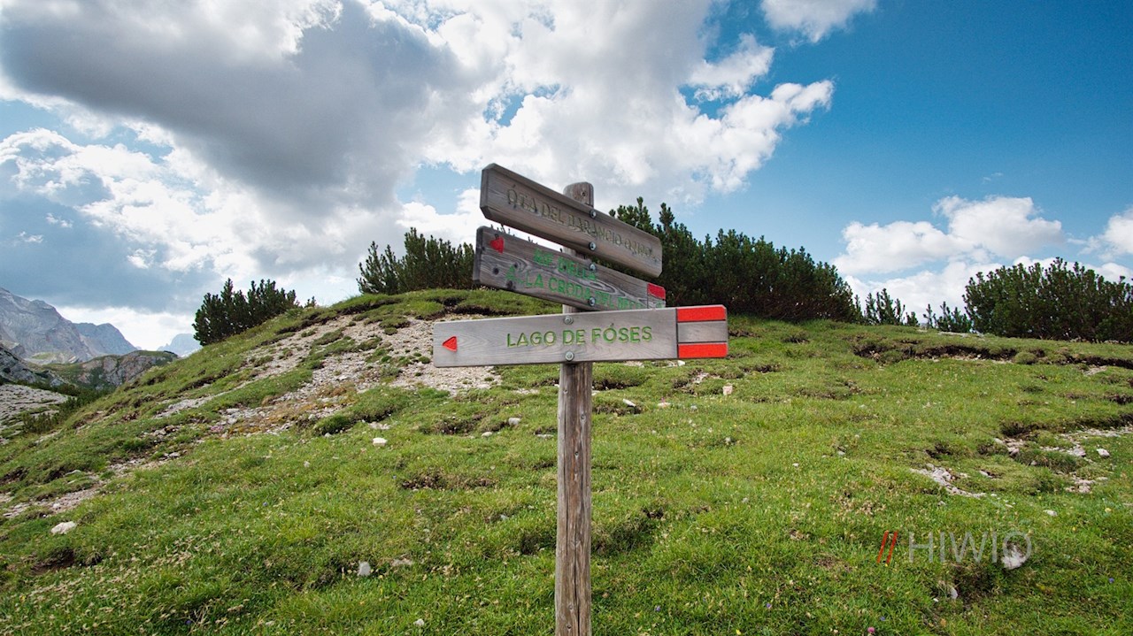 Neben der einladenden Schutzhütte folgt man dem breiten Panoramaweg Nr. 6A in Richtung Ra Stua / Cortina, von dem wenig später der Weg Nr. 6 zur Seekofelhütte und zum Fosses See wegführt.
