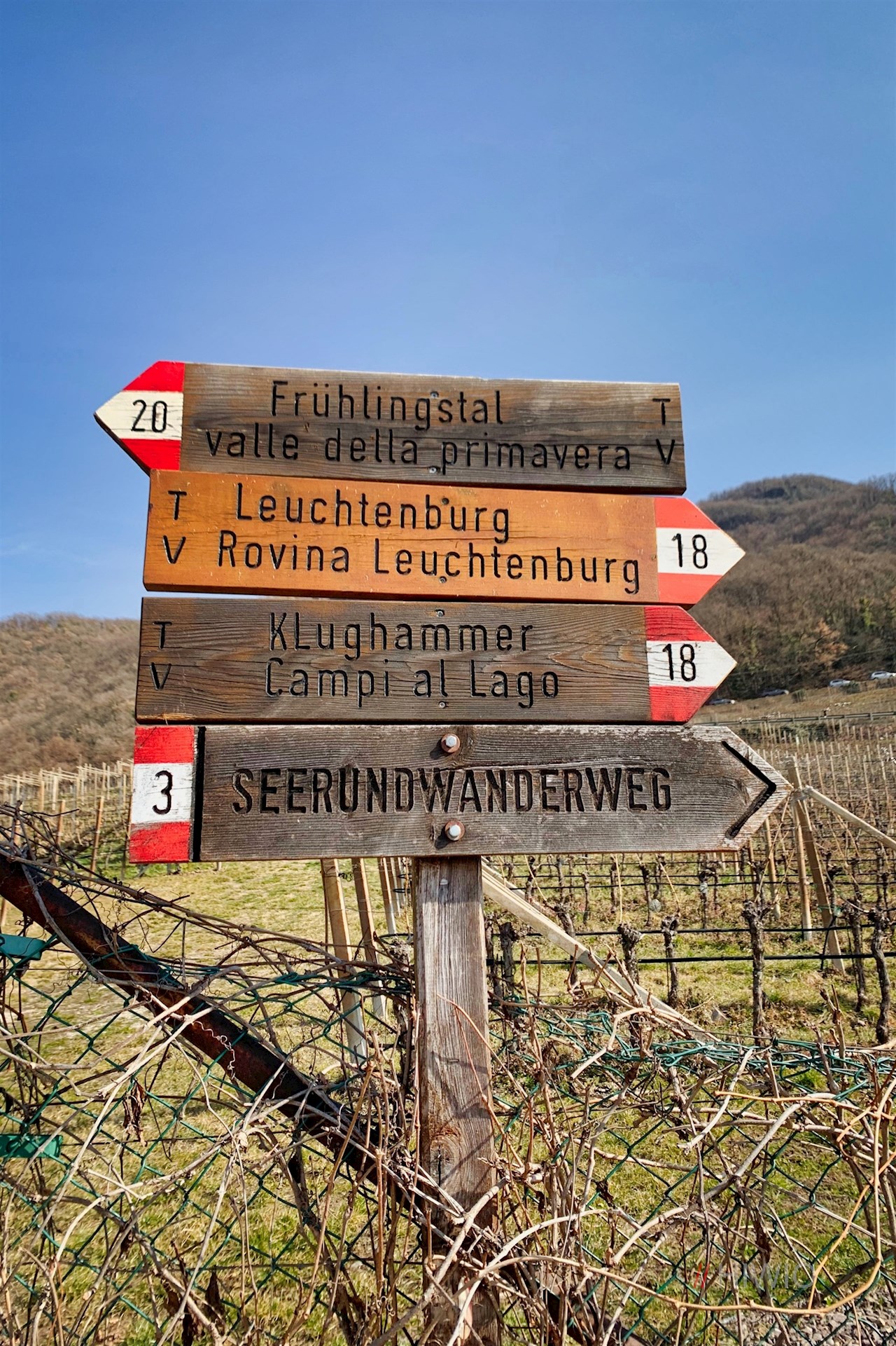 An der nächsten Weggabelung wendet sich der Wanderweg nach links und schlängelt sich vor der Kulisse des schimmernden Kalterer Sees und der über ihn wachenden Leuchtenburg zum Ausgangspunkt am See zurück, an dessen Ufern man die Wanderung in einem der einladenden Cafés ausklingen lassen kann.
