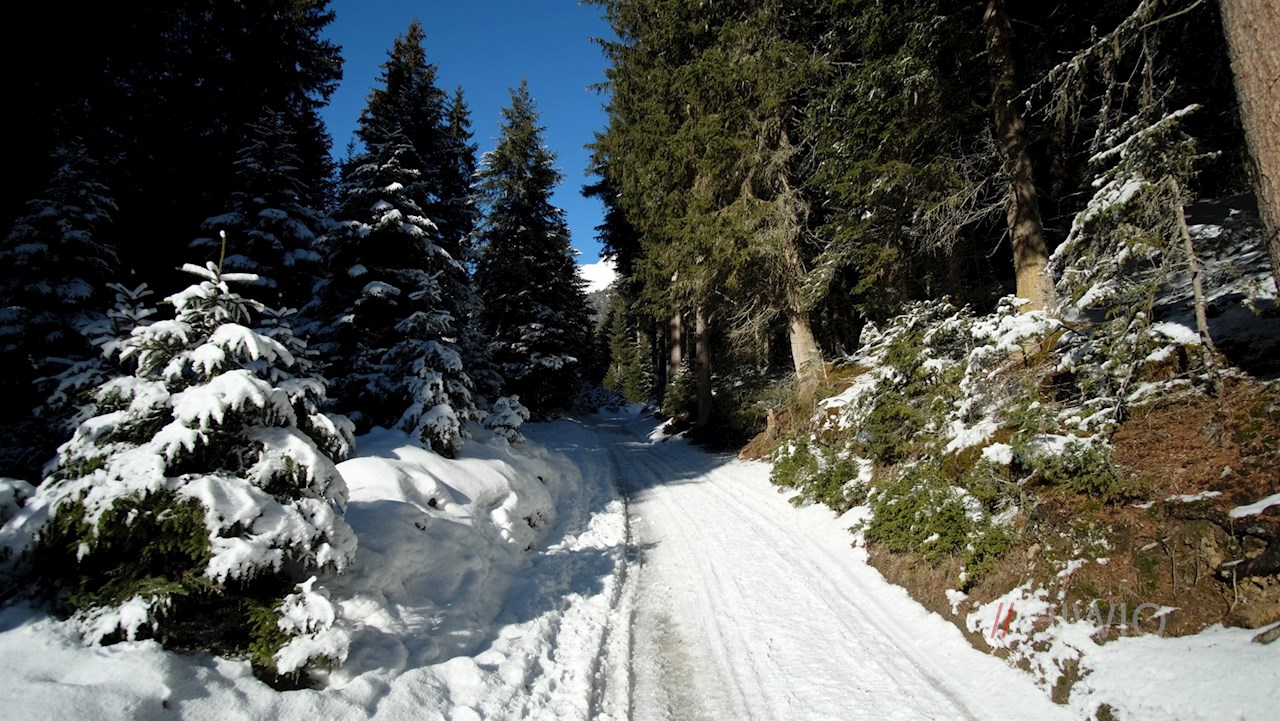 Stets der Beschilderung Nr. 5 in Richtung Freundalm folgend, führt der Wanderweg in angenehmer Steigung durch den winterlich verschneiten Wald.